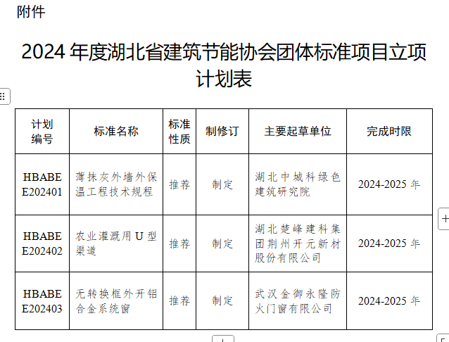 根据《团体标准管理办法》、《湖北省建筑节能协会团体标准制定工作管理办法(试行)》的有关规定,按照要求,经初审和答辩等程序,《薄抹灰外墙外保温工程技术规程》等3个制定项目列为2024年湖北省建筑节能协会团体标准项目立项计划。有关单位接此通知后,及时组织相关技术人员按照国家标准和有关规定,抓紧研究编写,按照确保标准适用性、坚持公开和协调一致原则、严格技术审查程序和注重标准实施推广的工作要求确保按期高质量完成项目计划。