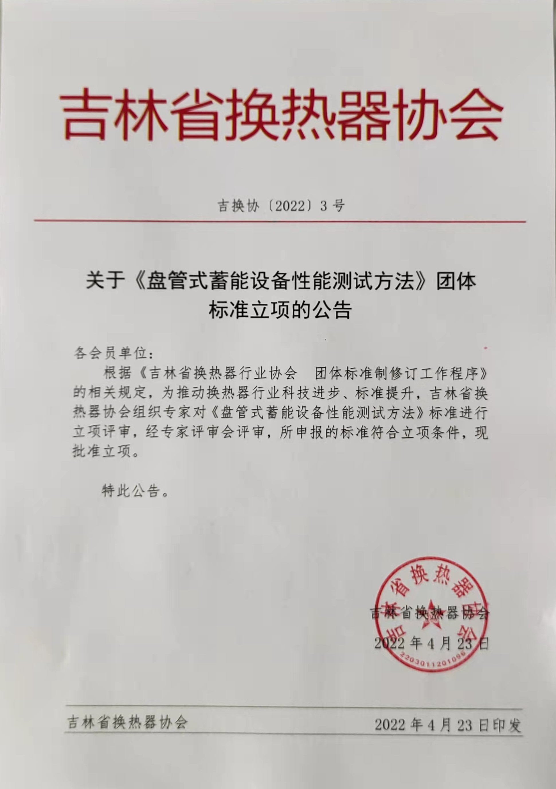 根据《吉林省换热器行业协会 团体标准制修订工作程序》的相关规定,为推动换热器行业科技进步、标准提升,吉林省换热器协会组织专家对《盘管式蓄能设备性能测试方法》标准进行立项评审,经专家评审会评审,所申报的标准符合立项条件,现批准立项。