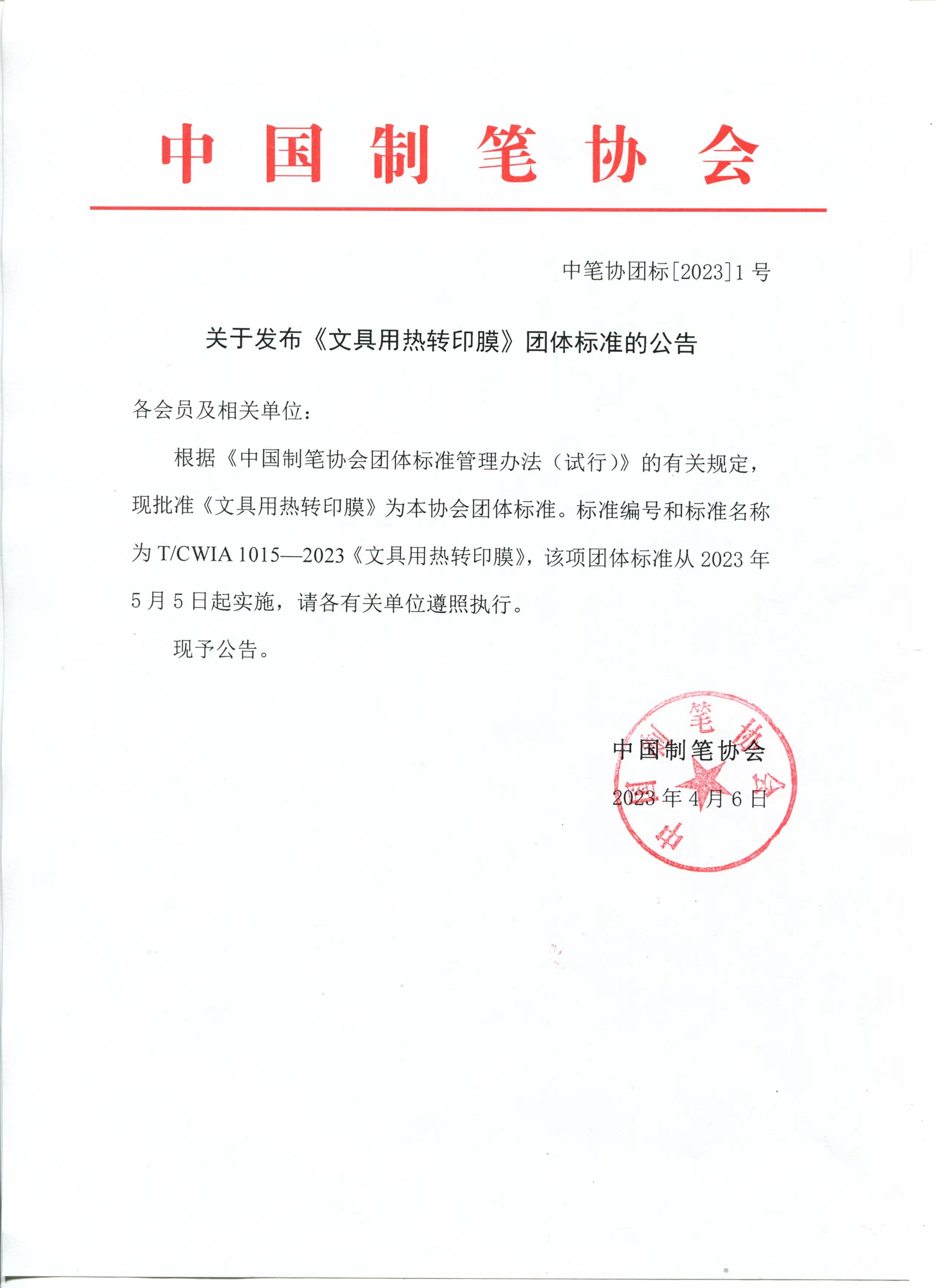 根据《中国制笔协会团体标准管理办法(试行)》的有关规定,现批准《文具用热转印膜》为本协会团体标准。标准编号和标准名称为T/CWIA 1015—2023《文具用热转印膜》,该项团体标准从2023年5月5日起实施,请各有关单位遵照执行。