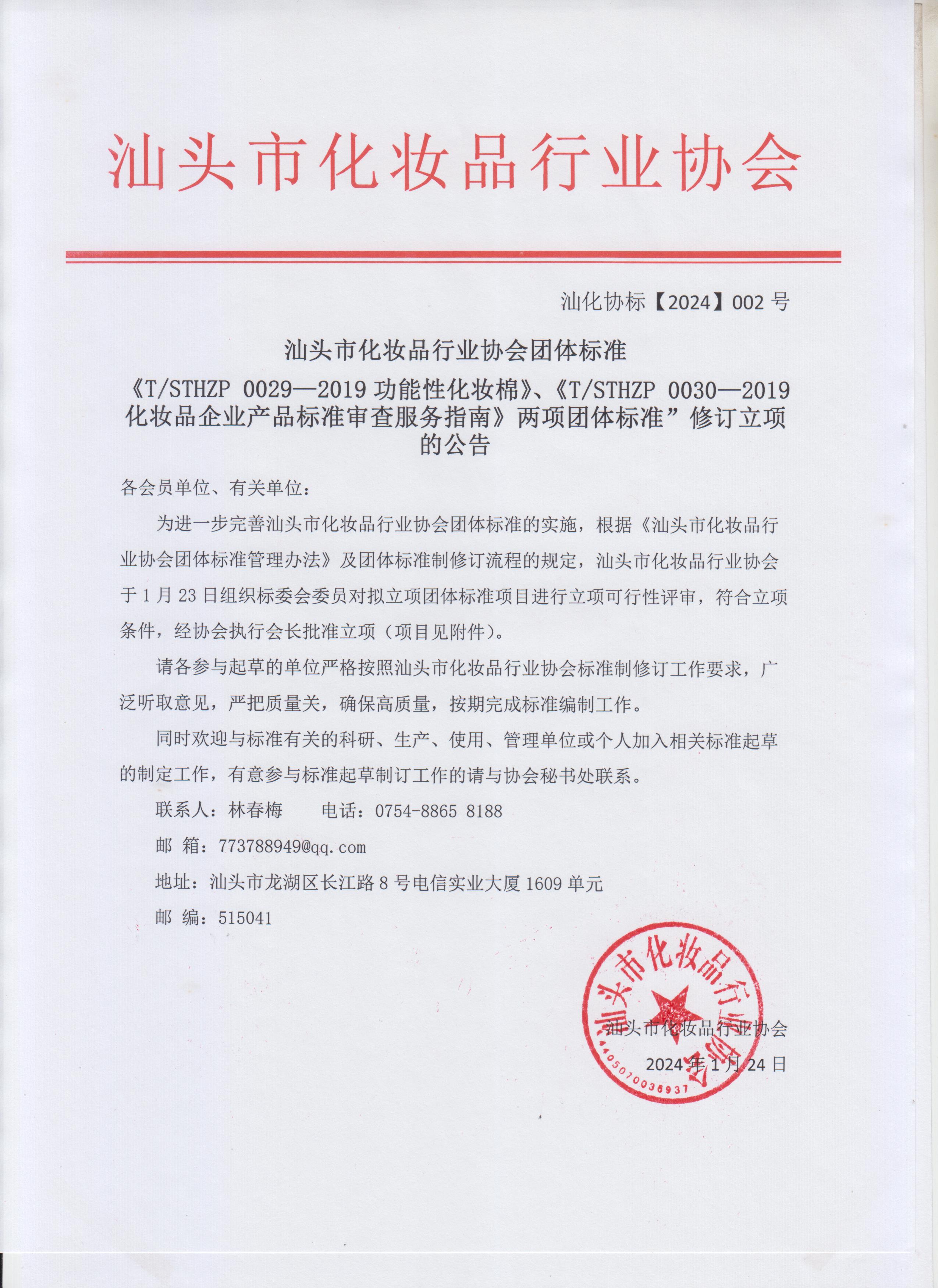 为进一步完善汕头市化妆品行业协会团体标准的实施,根据《汕头市化妆品行业协会团体标准管理办法》及团体标准制修订流程的规定,汕头市化妆品行业协会于1月23日组织标委会委员对拟立项团体标准项目进行立项可行性评审,符合立项条件,经协会执行会长批准立项(项目见附件)。