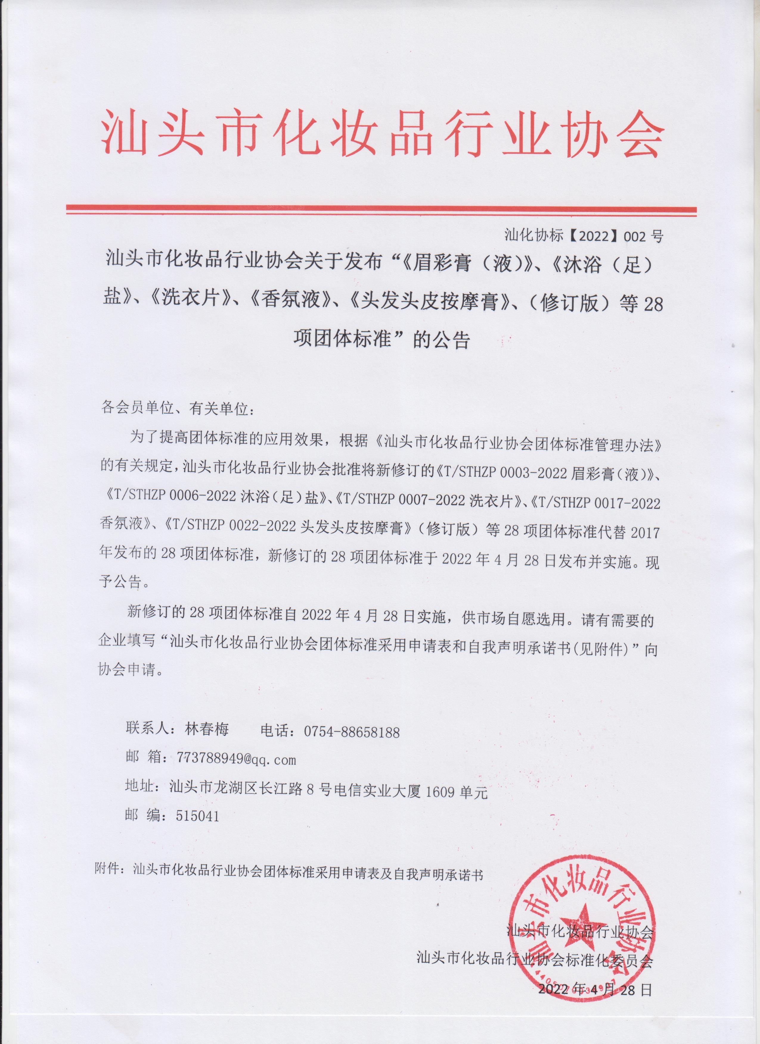 新修订的28项团体标准自2022年4月28日实施,供市场自愿选用。请有需要的企业填写“汕头市化妆品行业协会团体标准采用申请表和自我声明承诺书(见附件)”向协会申请。