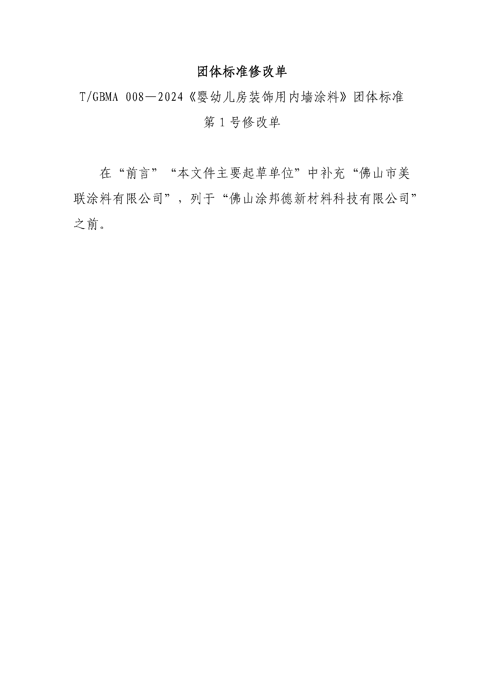 T/GBMA 008—2024《婴幼儿房装饰用内墙涂料》团体标准第1号修改单经我协会审查批准发布。该修改单于2024年12月17日起实施。修改单见附件。