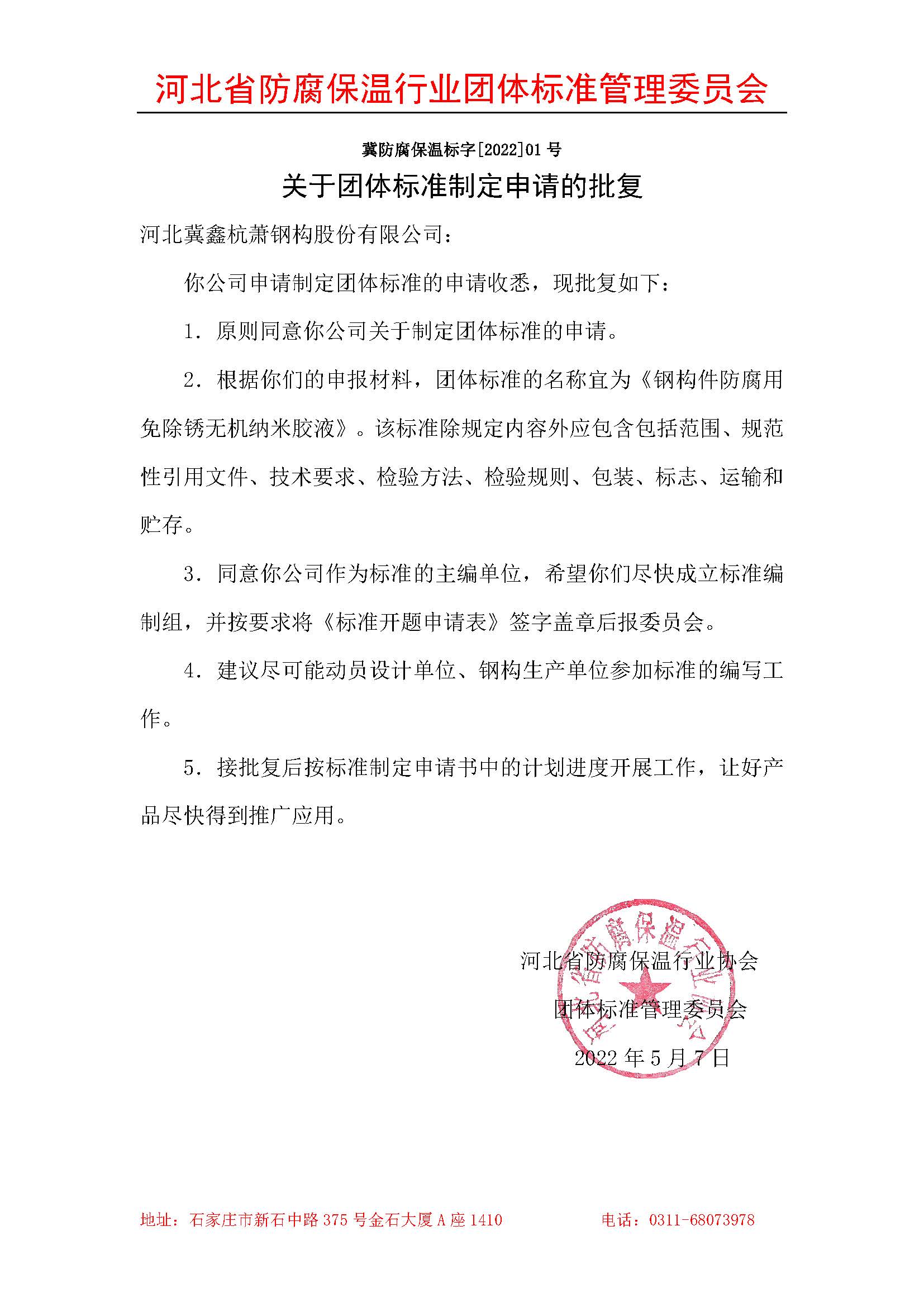 你公司申请制定团体标准的申请收悉,现批复如下: