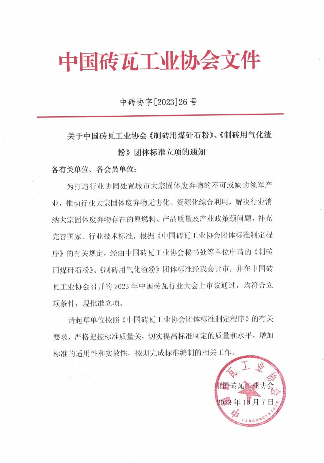中国砖瓦工业协会关于《制砖用煤矸石粉》、《制砖用气化渣粉》团体标准立项的通知