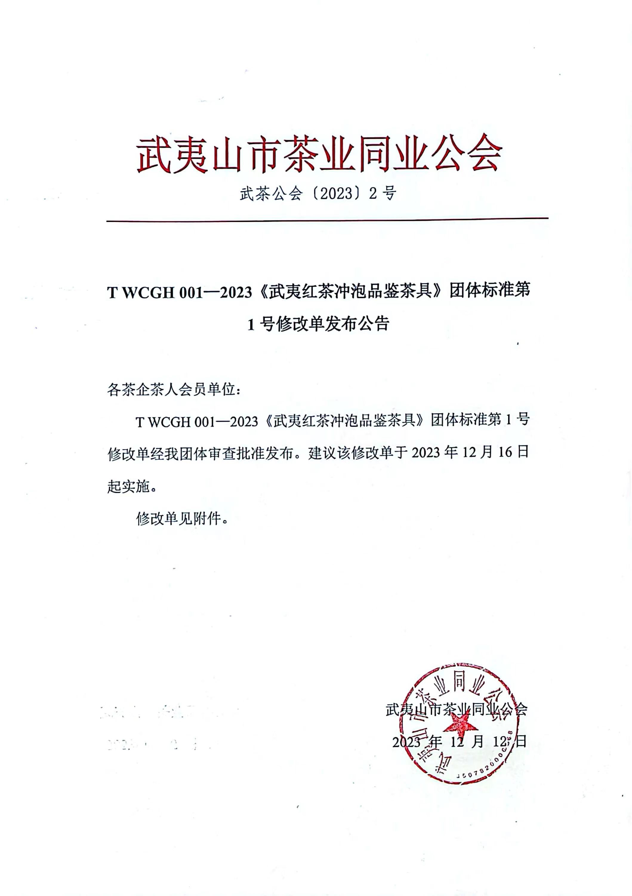 T WCGH 001—2023《武夷红茶冲泡品鉴茶具》团体标准第1号修改单经我团体审查批准发布。建议该修改单于2023年12月16日起实施。