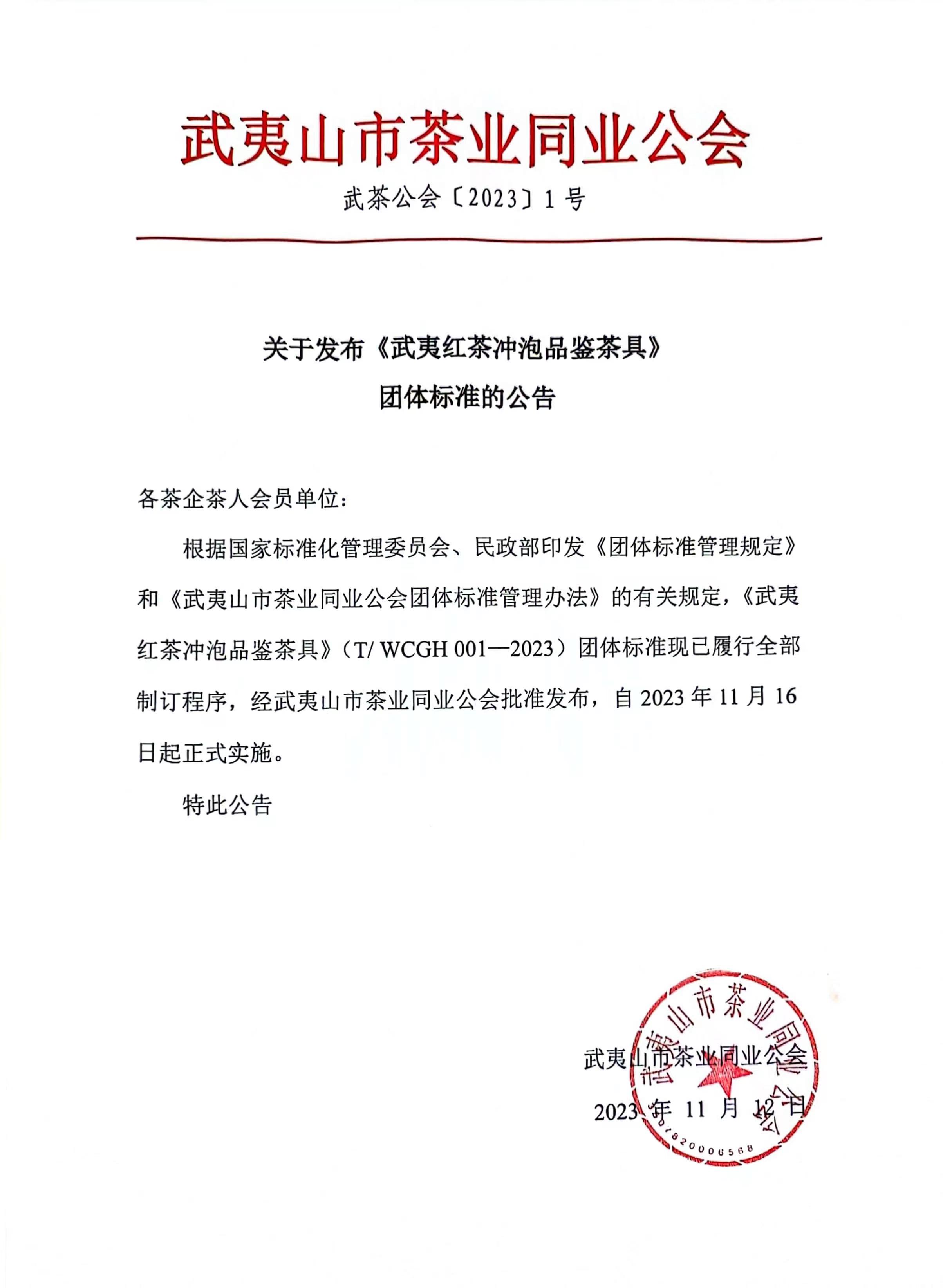 根据国家标准化管理委员会、民政部印发《团体标准管理规定》和《武夷山市茶业同业公会团体标准管理办法》的有关规定,《武夷红茶冲泡品鉴茶具》(T/ WCGH 001—2023)团体标准现已履行全部制订程序,经武夷山市茶业同业公会批准发布,自2023年11月16日起正式实施。