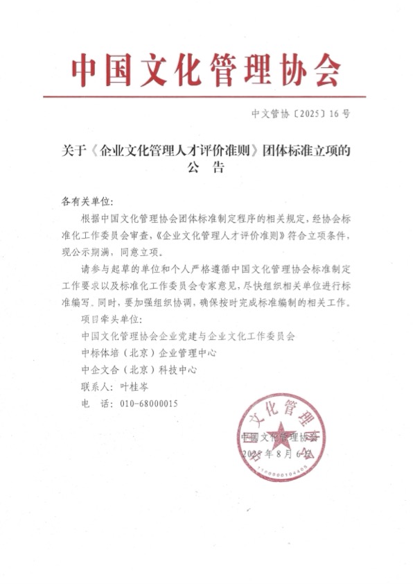 根据中国文化管理协会团体标准制定程序的相关规定,经协会标准化工作委员会审查,《企业文化管理人才评价准则》符合立项条件,现公示期满,同意立项。