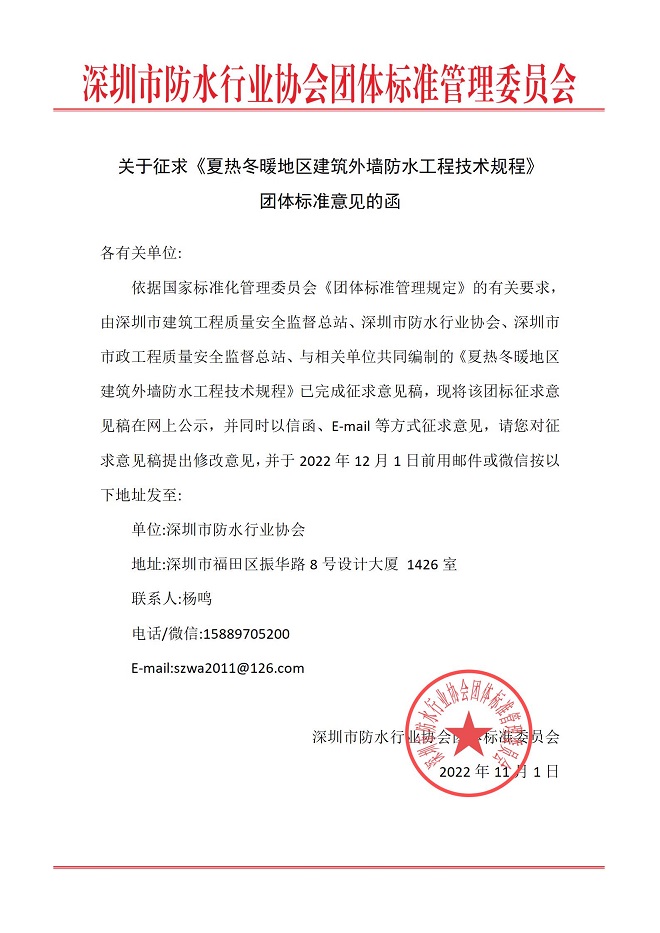 深圳市防水行业协会关于征求《夏热冬暖地区建筑外墙防水工程技术规程》团体标准意见的函