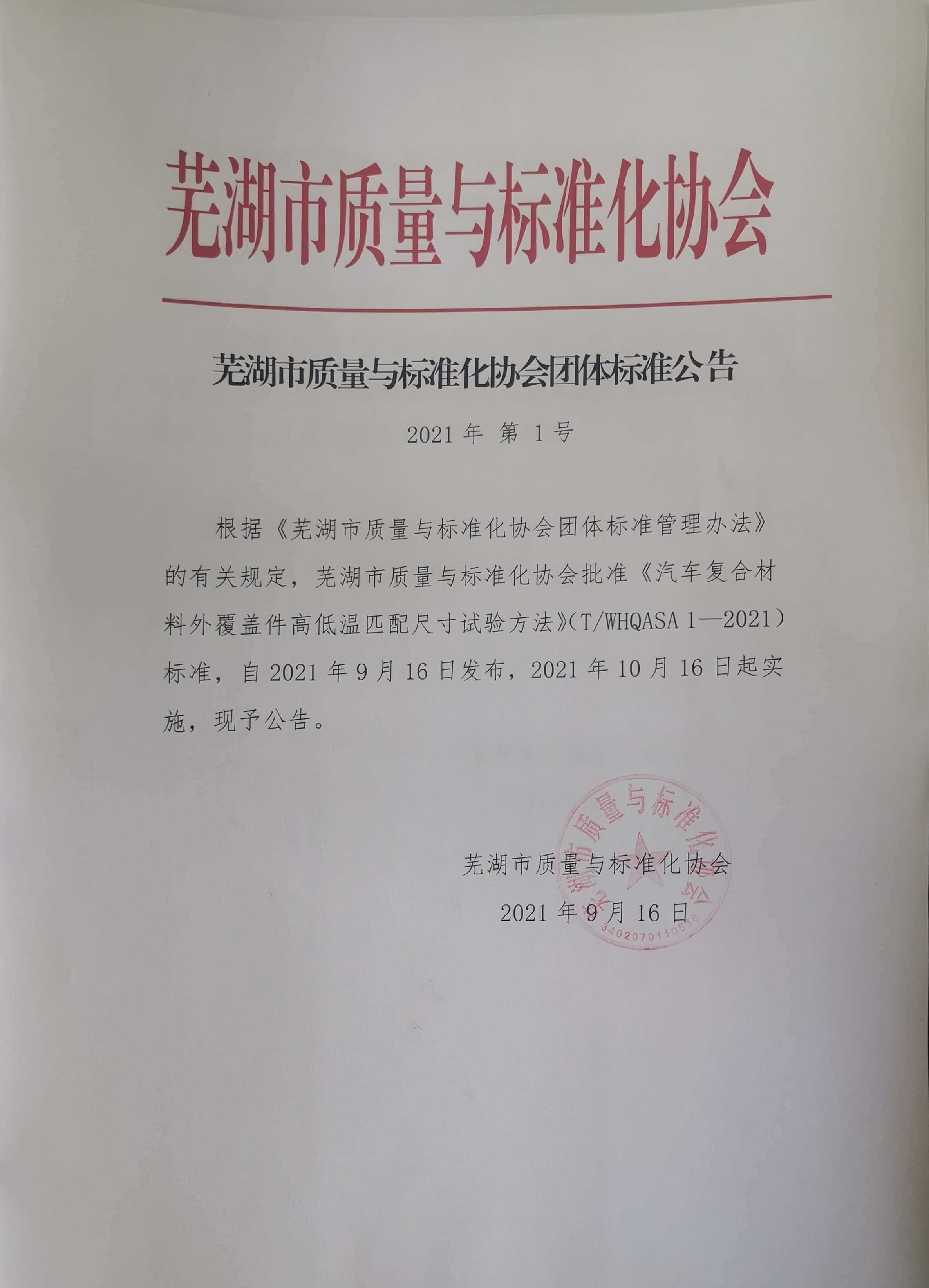 根据《芜湖市质量与标准化协会团体标准管理办法》的有关规定,芜湖市质量与标准化协会批准《汽车复合材料外覆盖件高低温匹配尺寸试验方法》(T/WHQASA 1—2021)标准,自2021年9月16日发布,2021年10月16日起实施,现予公告。