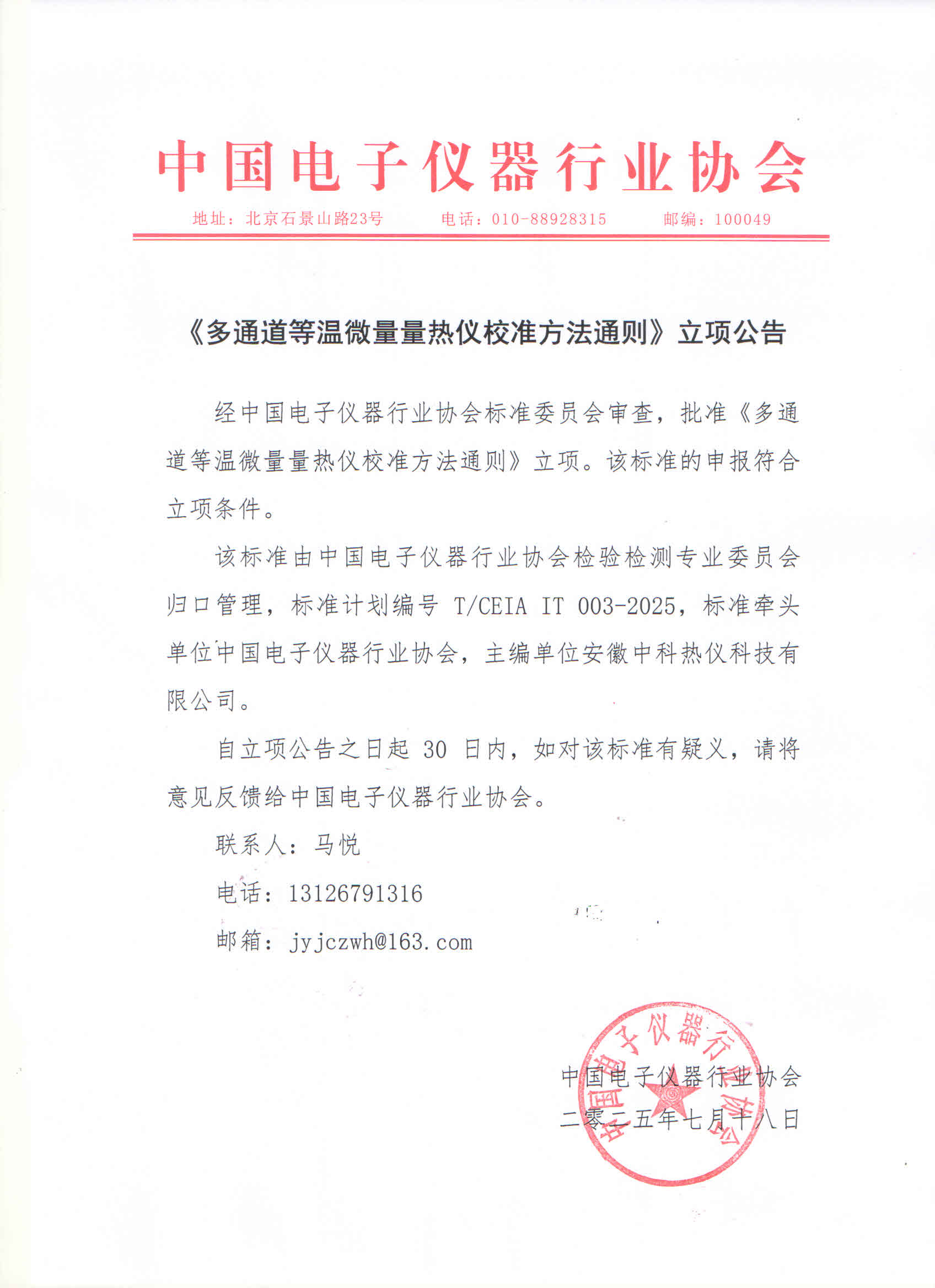 自立项公告之日起30日内,如对该标准有疑义,请将意见反馈给中国电子仪器行业协会。