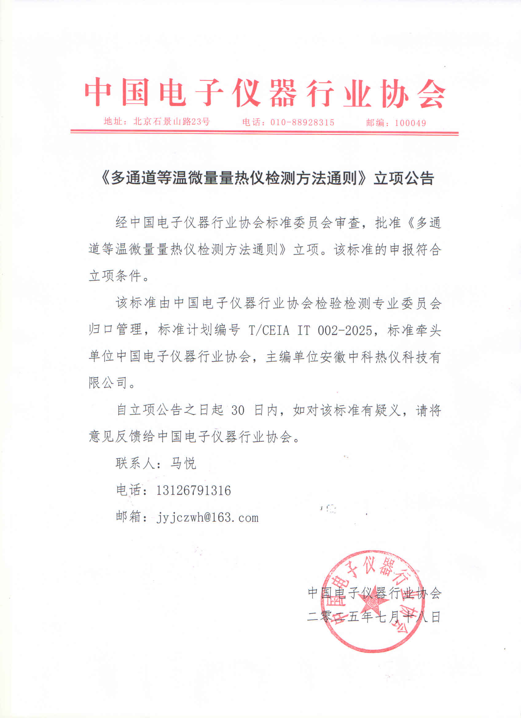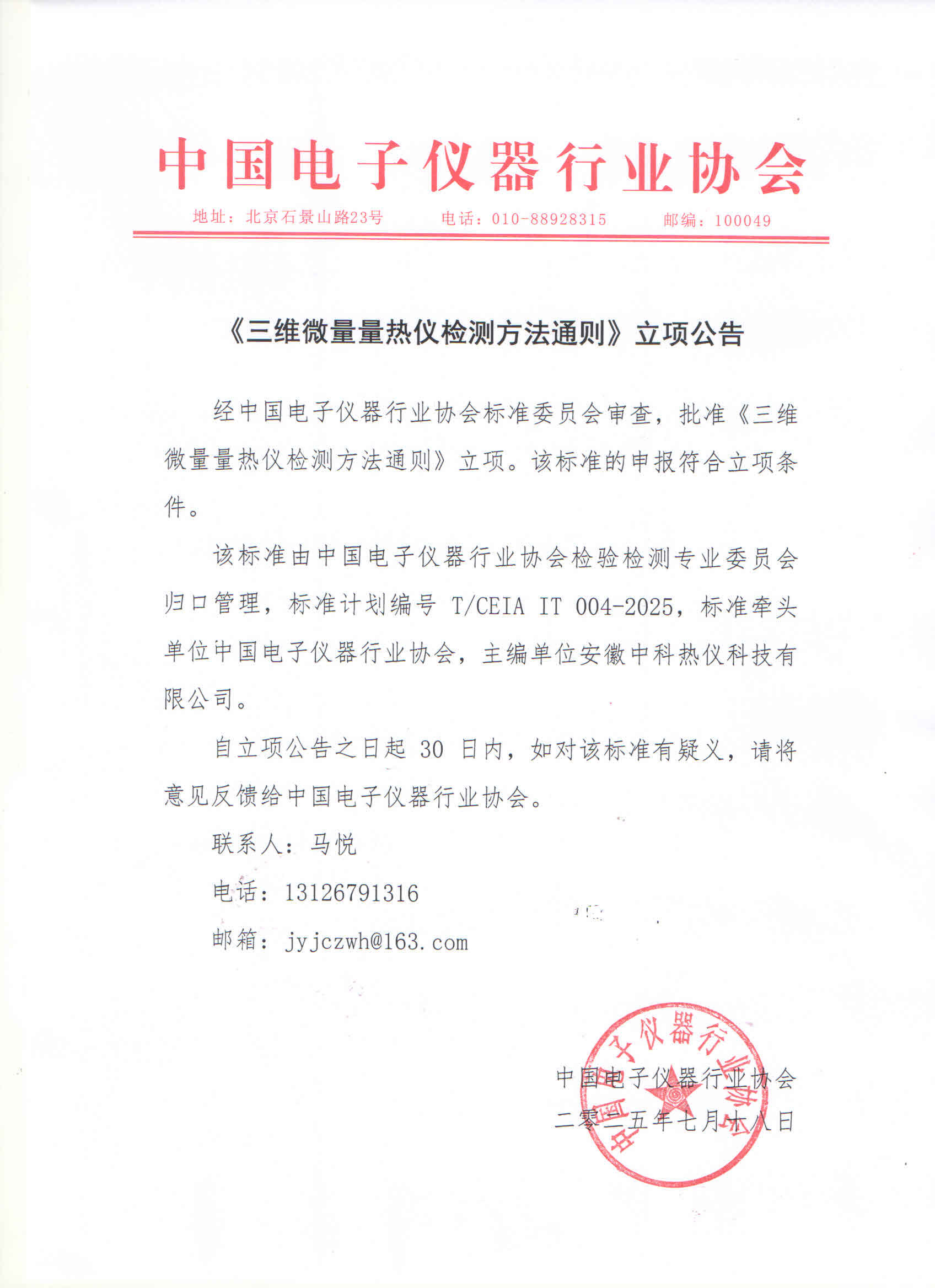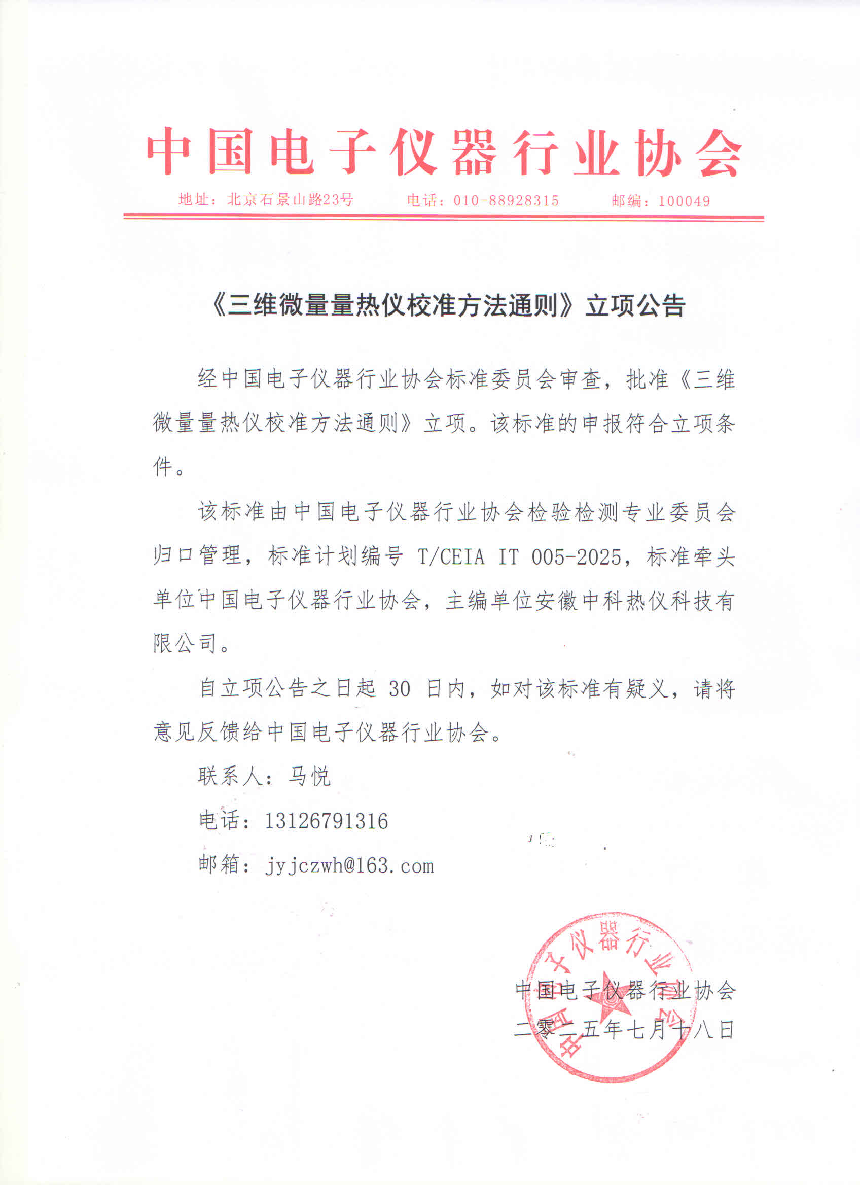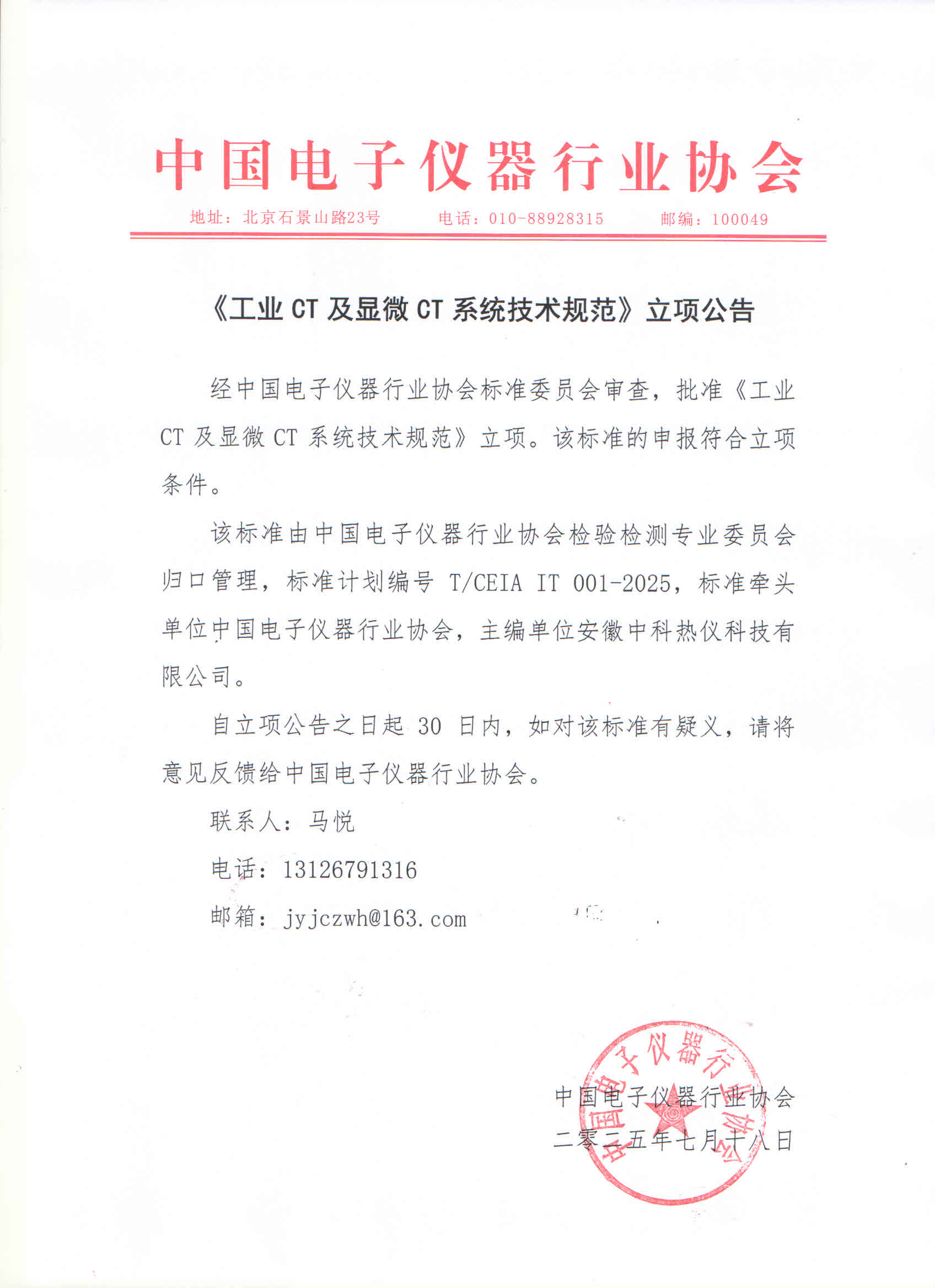 该标准由中国电子仪器行业协会检验检测专业委员会归口管理,《工业CT及显微CT系统技术规范》标准计划编号T/CEIA IT 001-2025,标准牵头单位中国电子仪器行业协会,主编单位安徽中科热仪科技有限公司;《多通道等温微量量热仪检测方法通则》标准计划编号T/CEIA IT 002-2025,标准牵头单位中国电子仪器行业协会,主编单位安徽中科热仪科技有限公司;《多通道等温微量量热仪校准方法通则》标准计划编号T/CEIA IT 003-2025,标准牵头单位中国电子仪器行业协会,主编单位安徽中科热仪科技有限公司;《三维微量量热仪检测方法通则》标准计划编号T/CEIA IT 004-2025,标准牵头单位中国电子仪器行业协会,主编单位安徽中科热仪科技有限公司;《三维微量量热仪校准方法通则》标准计划编号T/CEIA IT 005-2025,标准牵头单位中国电子仪器行业协会,主编单位安徽中科热仪科技有限公司。