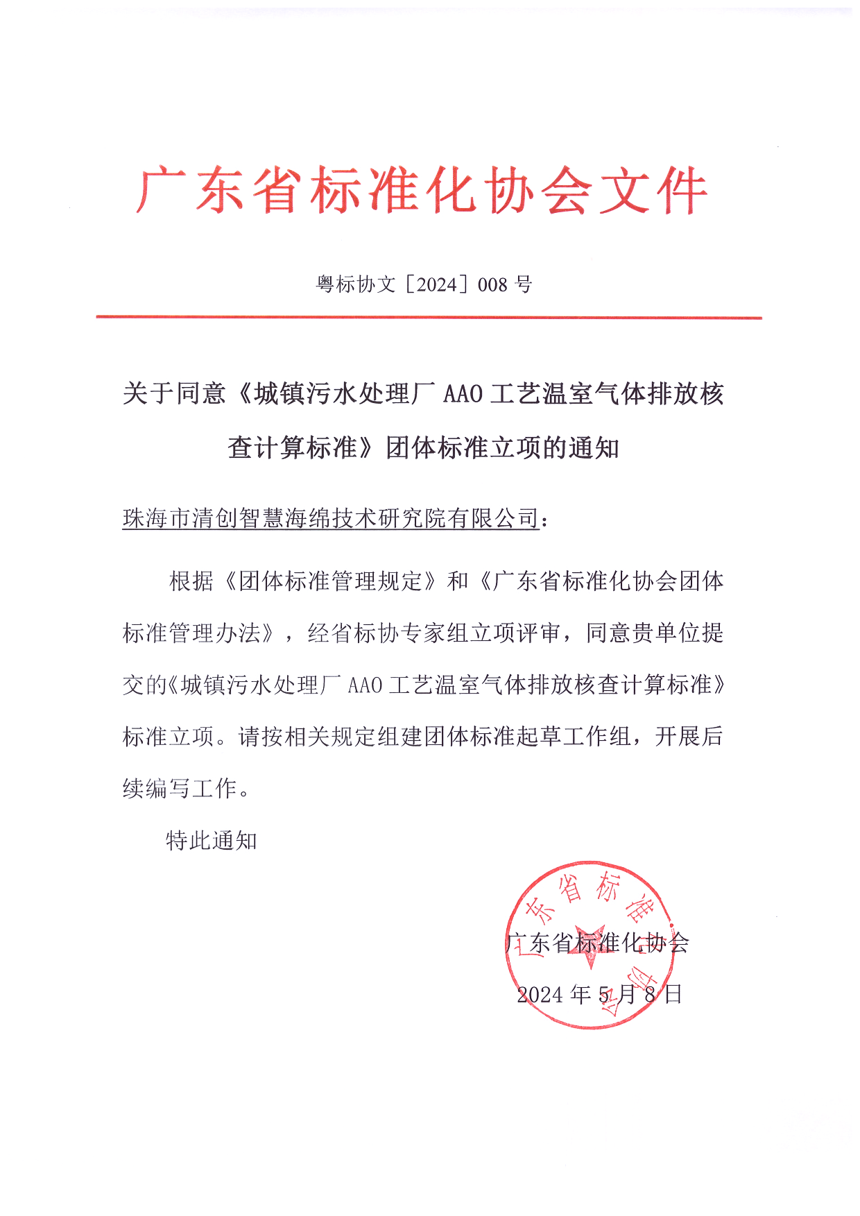 关于同意《城镇污水处理厂AAO工艺温室气体排放核查计算标准》团体标准立项的通知.png