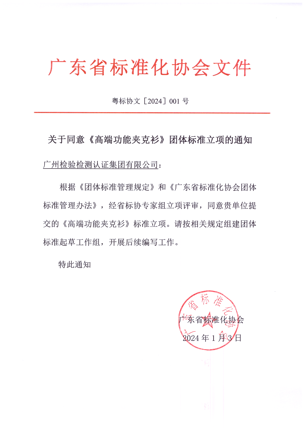 根据《团体标准管理规定》和《广东省标准化协会团体标准管理办法》,经省标协专家组立项评审,同意贵单位提交的《高端功能夹克衫》标准立项。请按相关规定组建团体标准起草工作组,开展后续编写工作。