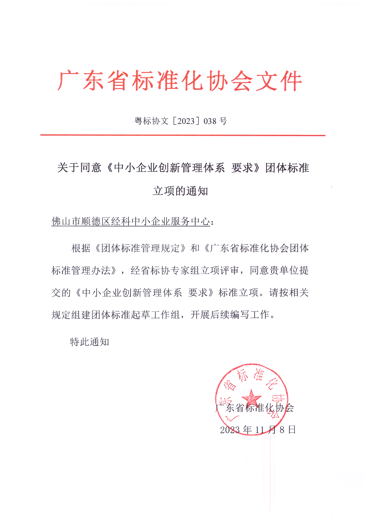 根据《团体标准管理规定》和《广东省标准化协会团体标准管理办法》,经省标协专家组立项评审,同意贵单位提交的《中小企业创新管理体系 要求》标准立项。请按相关规定组建团体标准起草工作组,开展后续编写工作。