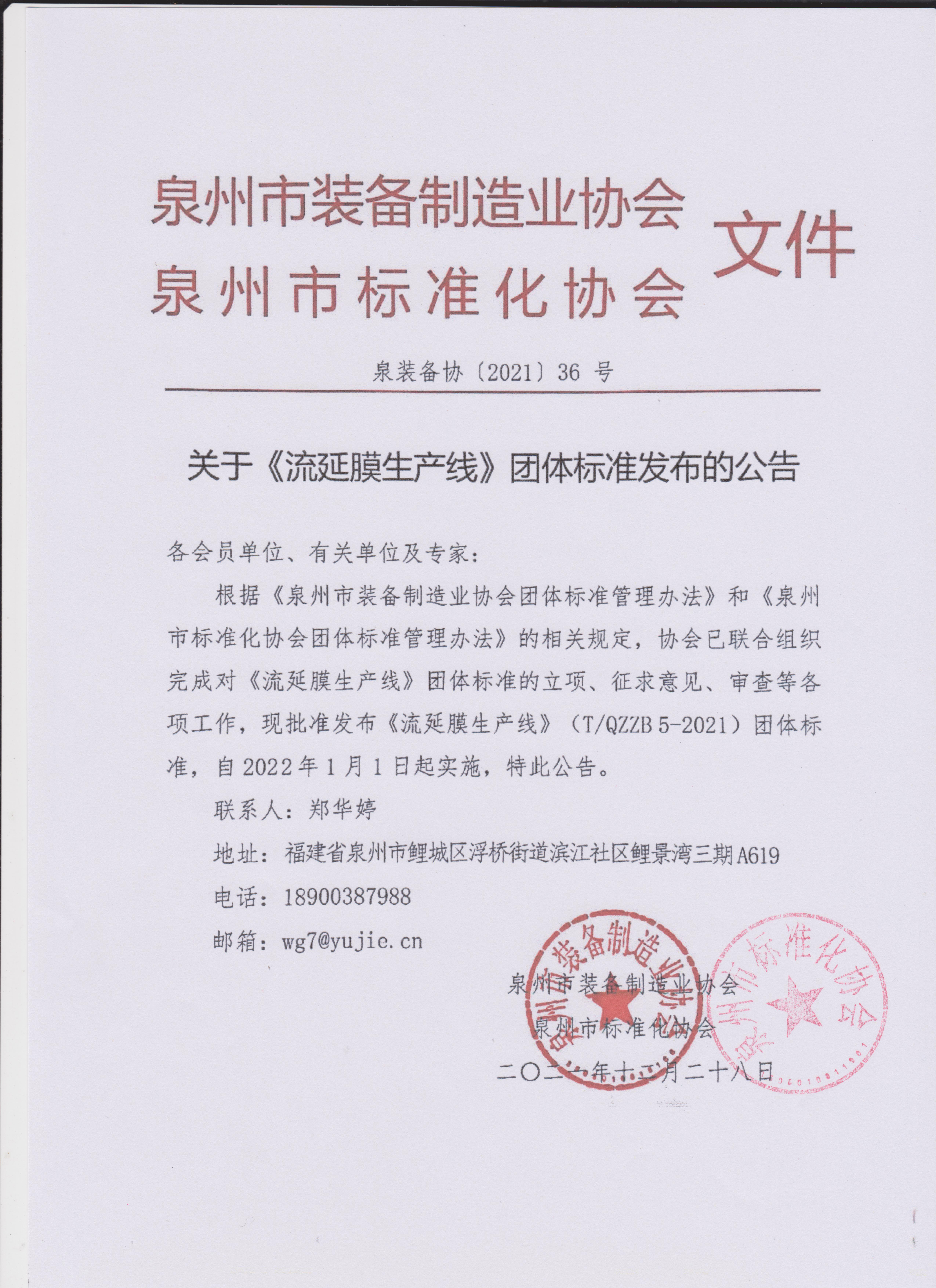 根据《泉州市装备制造业协会团体标准管理办法》和《泉州市标准化协会团体标准管理办法》的相关规定,协会已联合组织完成对《流延膜生产线》团体标准的立项、征求意见、审查等各项工作,现批准发布《流延膜生产线》(T/QZZB 5-2021)团体标准,自2022年1月1日起实施,特此公告。