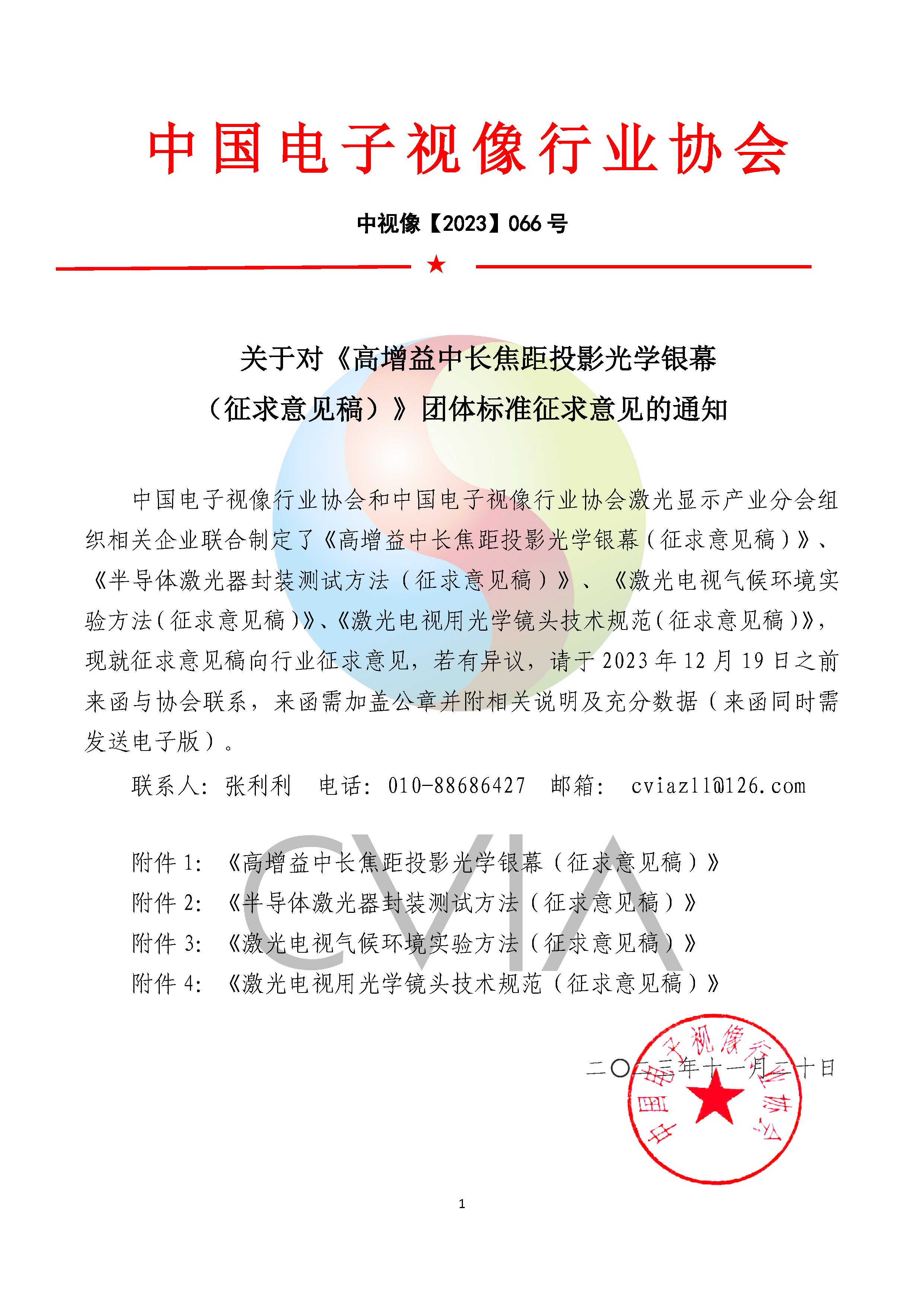 中国电子视像行业协会和中国电子视像行业协会激光显示产业分会组织相关企业联合制定了《高增益中长焦距投影光学银幕(征求意见稿)》、《半导体激光器封装测试方法(征求意见稿)》、《激光电视气候环境实验方法(征求意见稿)》、《激光电视用光学镜头技术规范(征求意见稿)》,现就征求意见稿向行业征求意见,若有异议,请于2023年12月19日之前来函与协会联系,来函需加盖公章并附相关说明及充分数据(来函同时需发送电子版)。