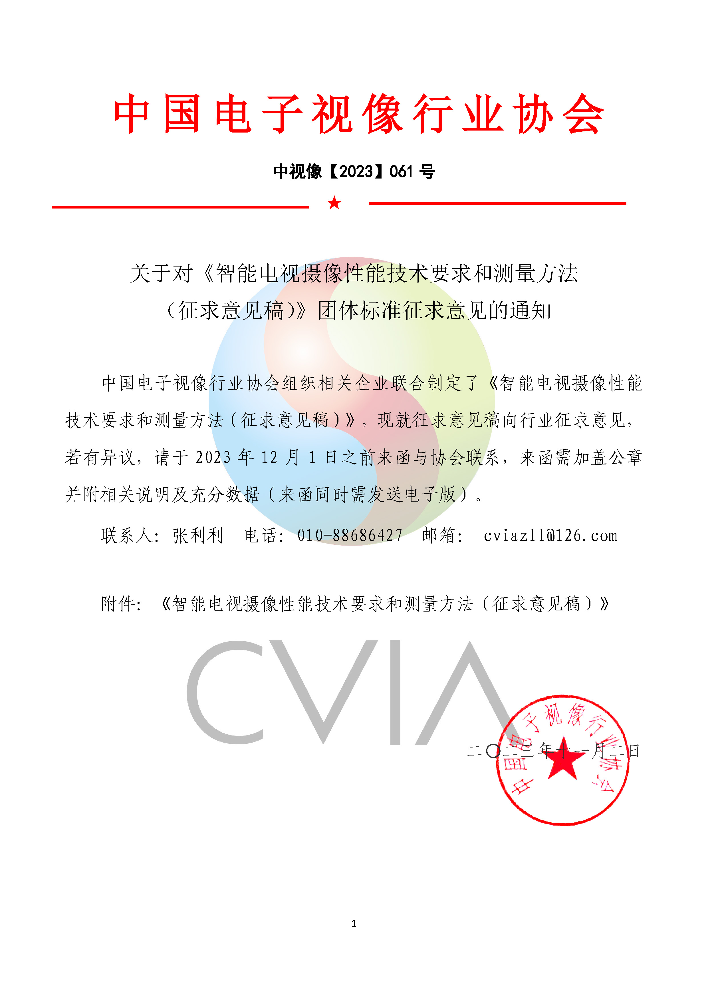 中国电子视像行业协会组织相关企业联合制定了《智能电视摄像性能技术要求和测量方法(征求意见稿)》,现就征求意见稿向行业征求意见,若有异议,请于2023年12月1日之前来函与协会联系,来函需加盖公章并附相关说明及充分数据(来函同时需发送电子版)。
