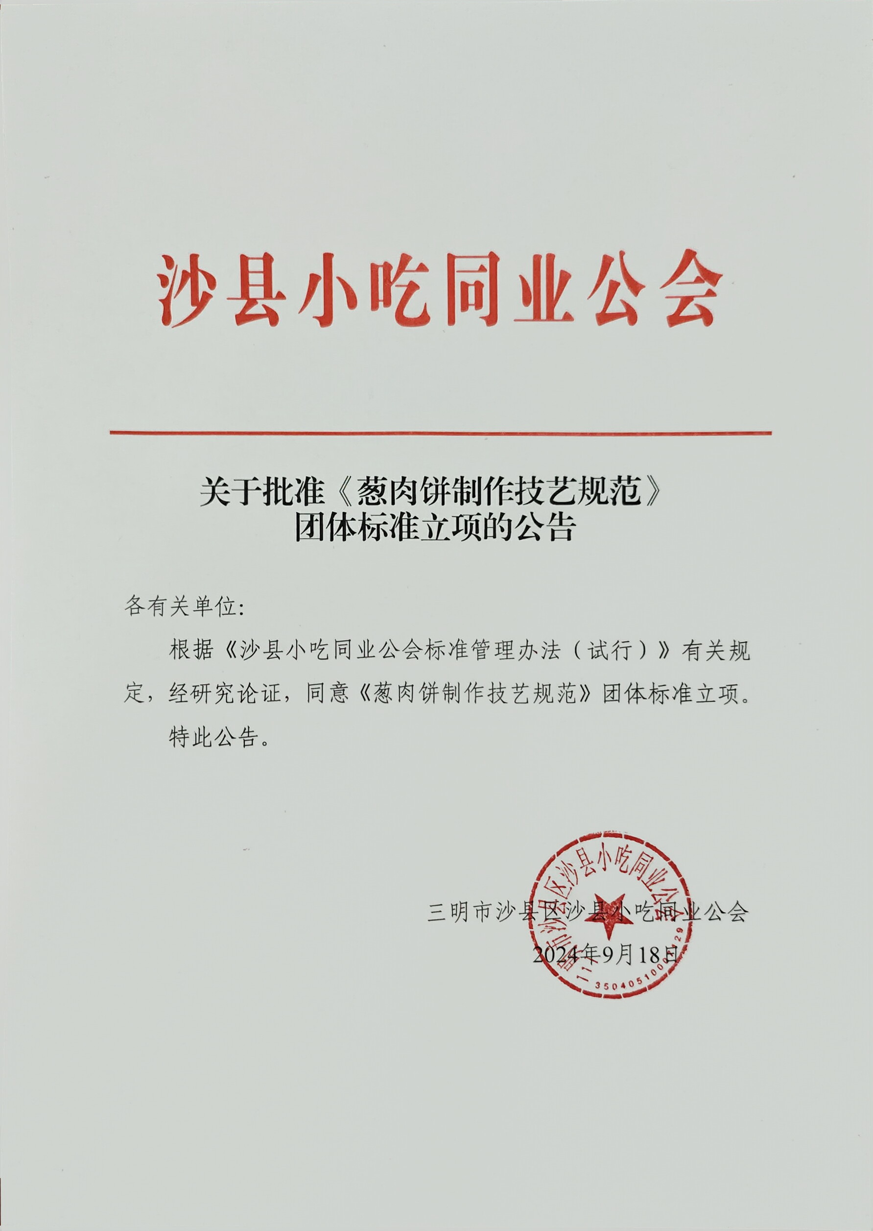 三明市沙县区沙县小吃同业公会关于批准《葱肉饼制作技艺规范》团体标准立项的公告