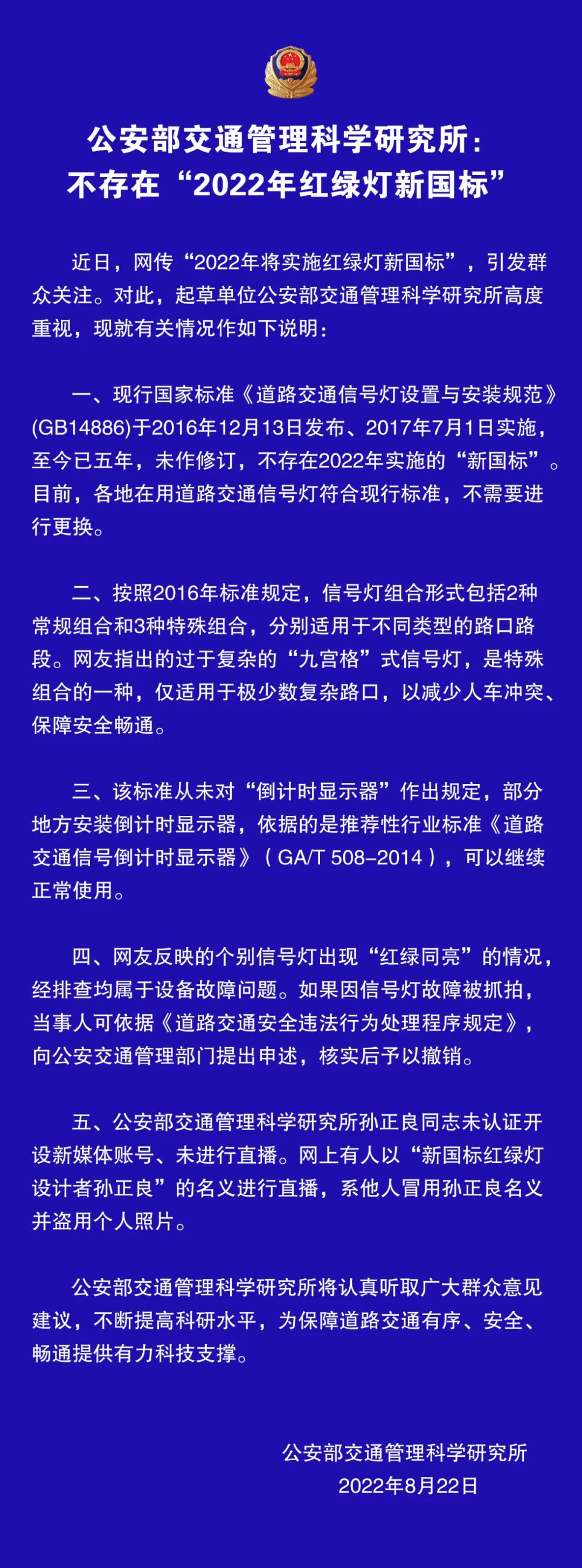 近日,网传“2022年将实施红绿灯新国标”,引发群众关注。对此,起草单位公安部交通管理科学研究所高度重视,现就有关情况作如下说明: