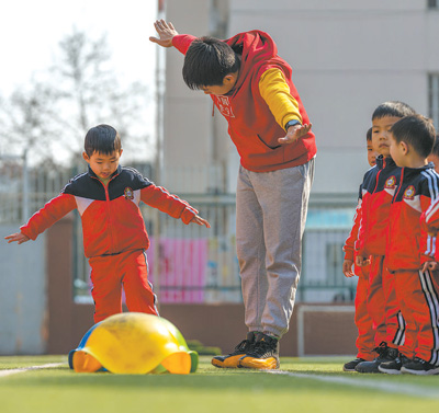 安徽合肥市肥东县积极发展3岁以下婴幼儿托育服务。图为该县亲亲幼儿园托育班的孩子们在上户外体能课。