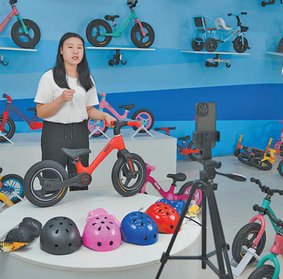 “六一”国际儿童节前夕,在河北邢台市平乡县童车玩具供应链直播基地,一名主播在网上销售童车和护具。