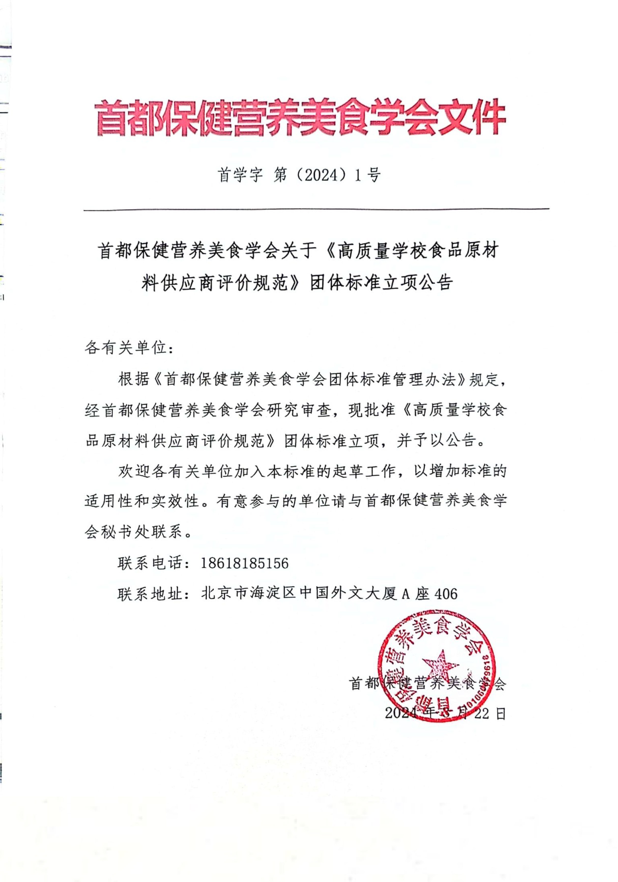 根据《首都保健营养美食学会团体标准管理办法》规定,经首都保健营养美食学会研究审查,现批准《高质量学校食品原材料供应商评价规范》团体标准立项,并予以公告。
