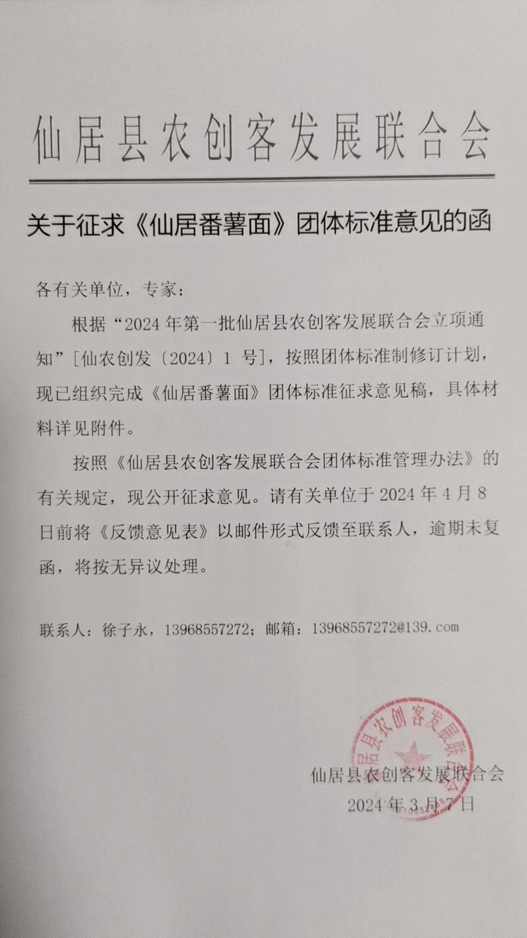 按照《仙居县农创客发展联合会团体标准管理办法》的有关规定,现公开征求意见。请有关单位于2024年4月8日前将《反馈意见表》以邮件形式反馈至联系人,逾期未复函,将按无异议处理。