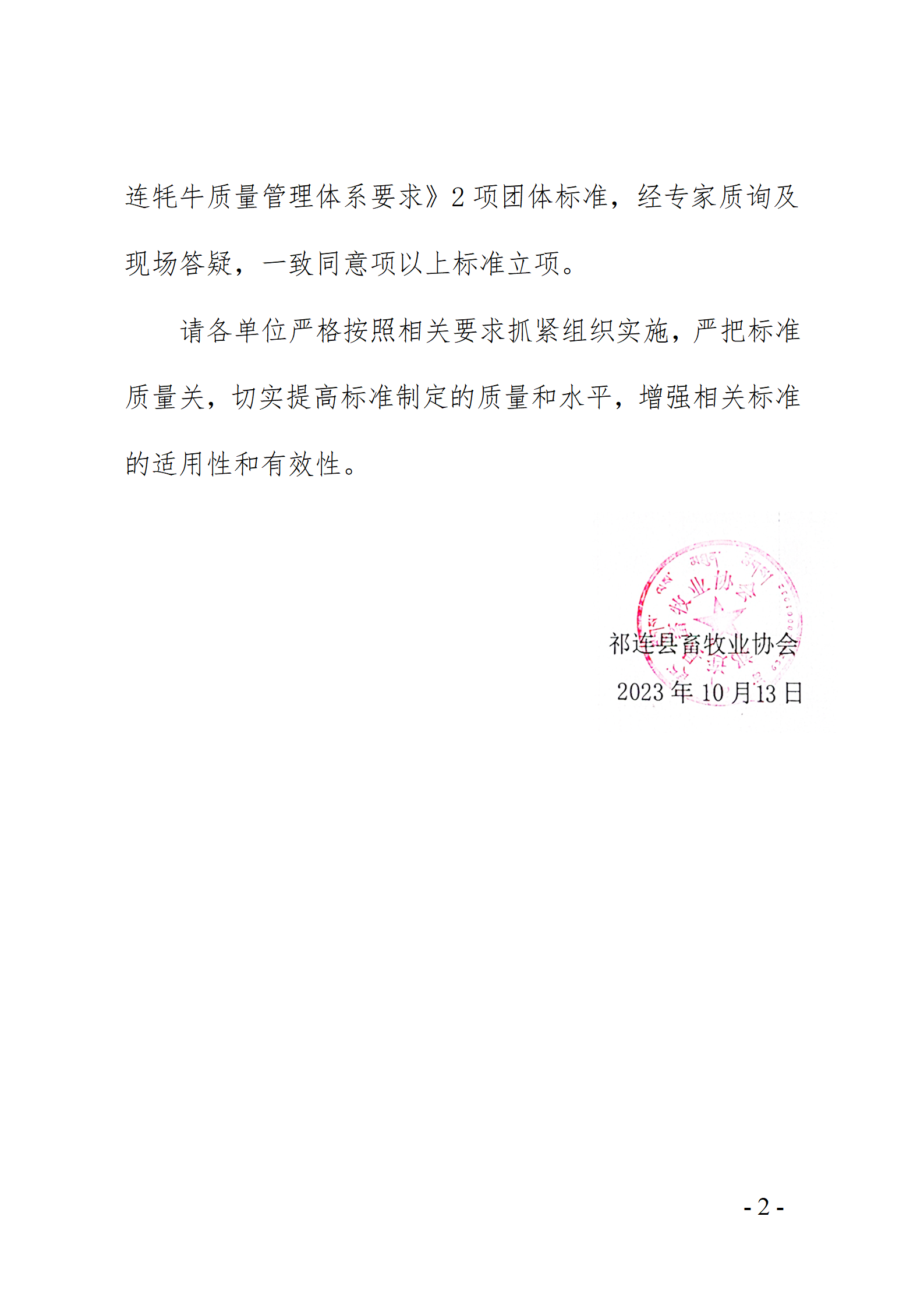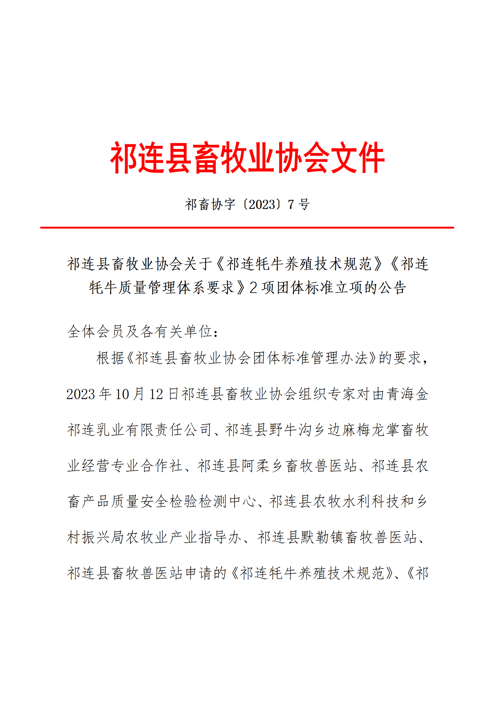 根据《祁连县畜牧业协会团体标准管理办法》的要求,2023年10月12日祁连县畜牧业协会组织专家对由青海金祁连乳业有限责任公司、祁连县野牛沟乡边麻梅龙掌畜牧业经营专业合作社、祁连县阿柔乡畜牧兽医站、祁连县农畜产品质量安全检验检测中心、祁连县农牧水利科技和乡村振兴局农牧业产业指导办、祁连县默勒镇畜牧兽医站、祁连县畜牧兽医站申请的《祁连牦牛养殖技术规范》、《祁连牦牛质量管理体系要求》2项团体标准,经专家质询及现场答疑,一致同意项以上标准立项。