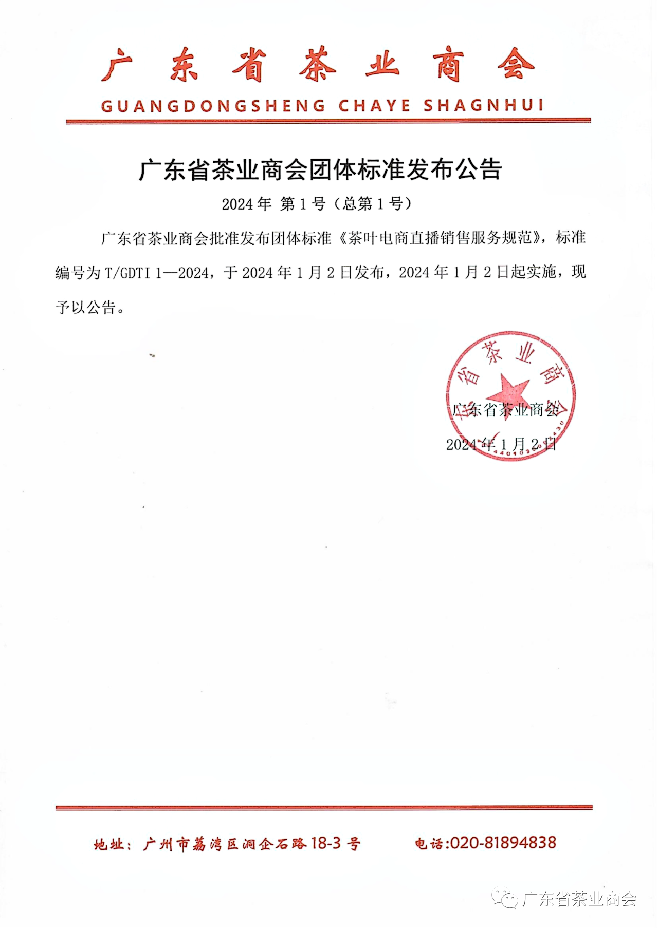 广东省茶业商会批准发布团体标准《茶叶电商直播销售服务规范》,标准编号为T/GDTI 1-2024,于2024年1月2日发布,2024年1月2日起实施,现予以公告。
