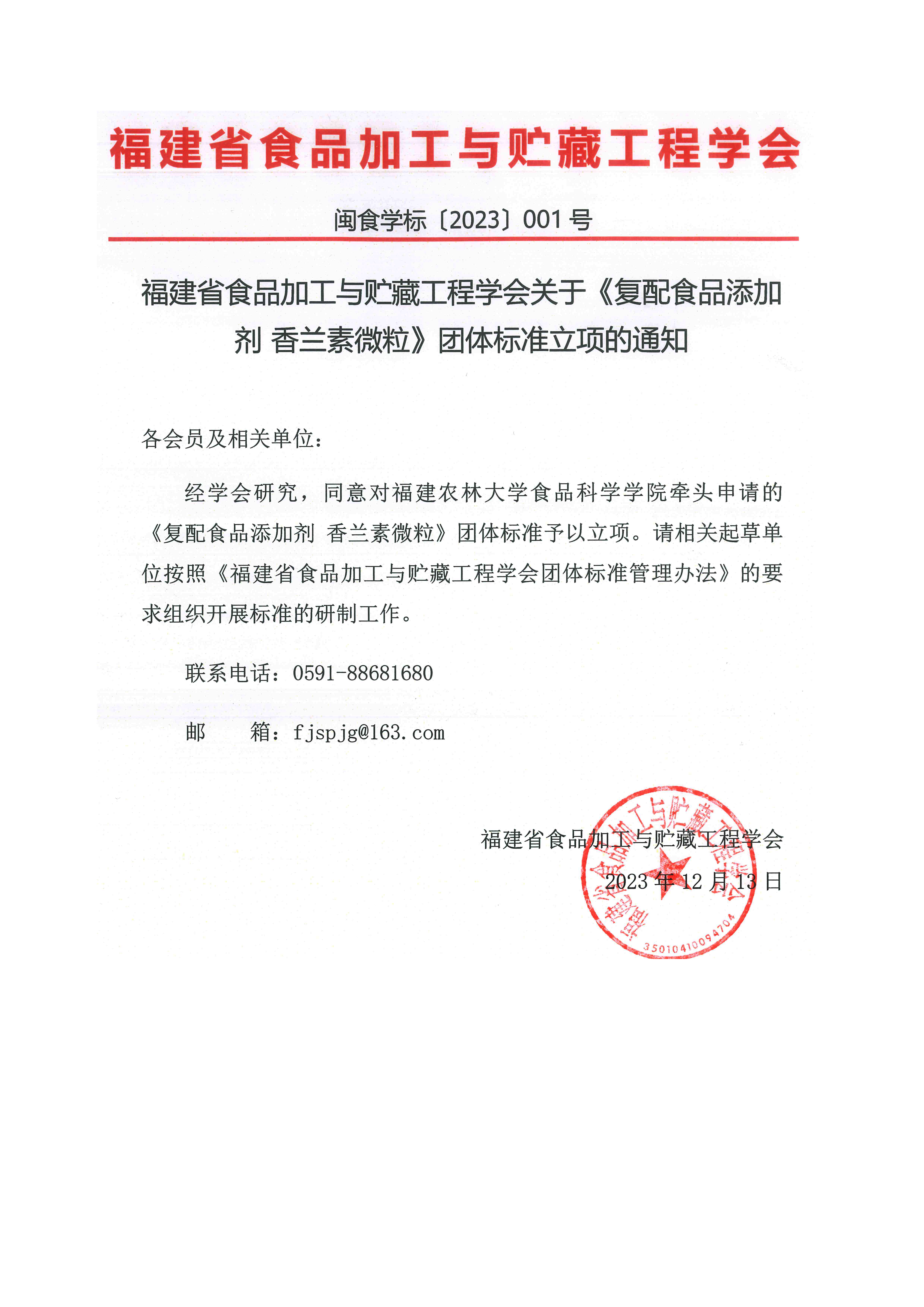 经学会研究,同意对福建农林大学食品科学学院牵头申请的《复配食品添加剂 香兰素微粒》团体标准予以立项。请相关起草单位按照《福建省食品加工与贮藏工程学会团体标准管理办法》的要求组织开展标准的研制工作。