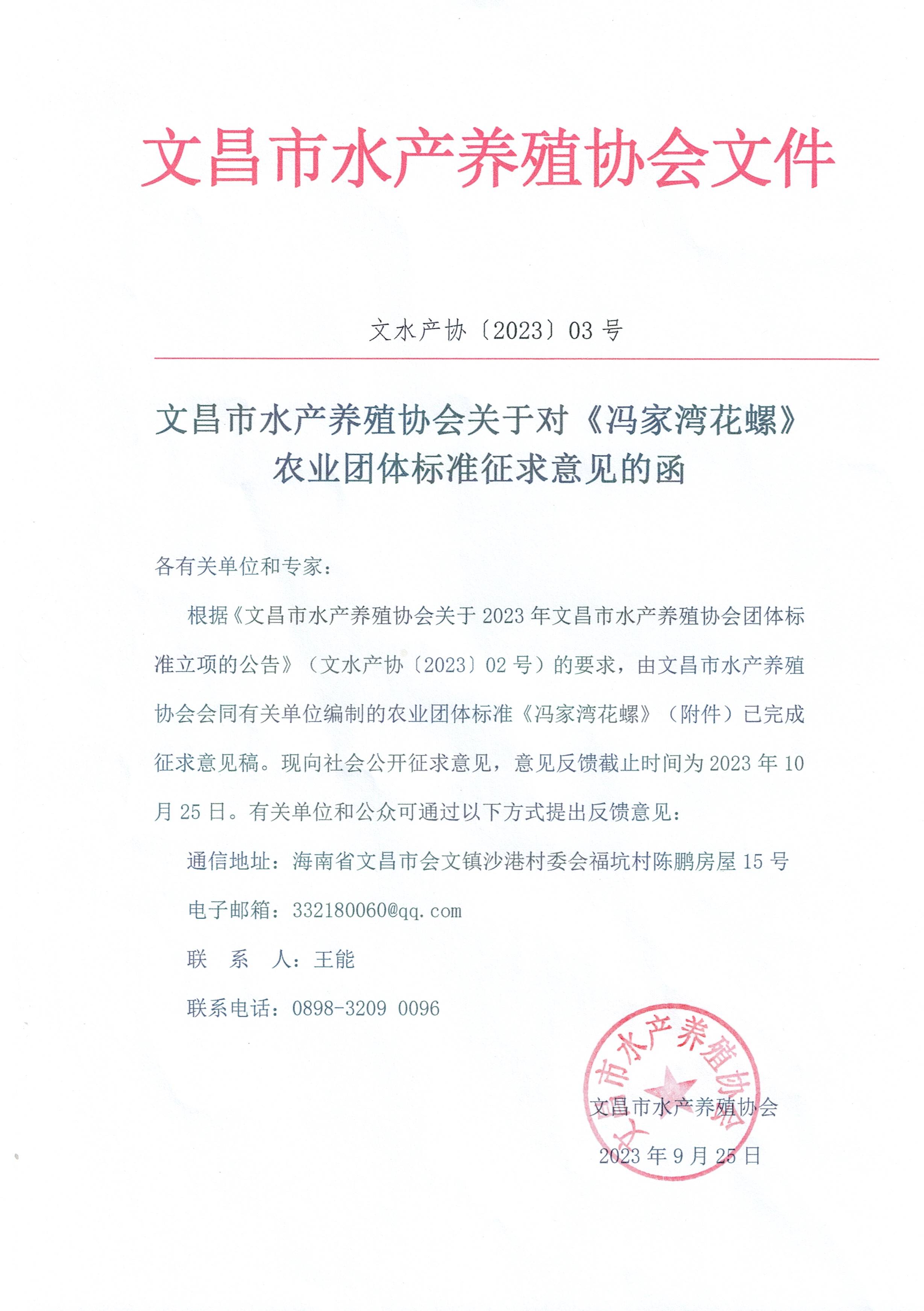 文昌市水产养殖协会关于对《冯家湾花螺》农业团体标准征求意见的函.jpg