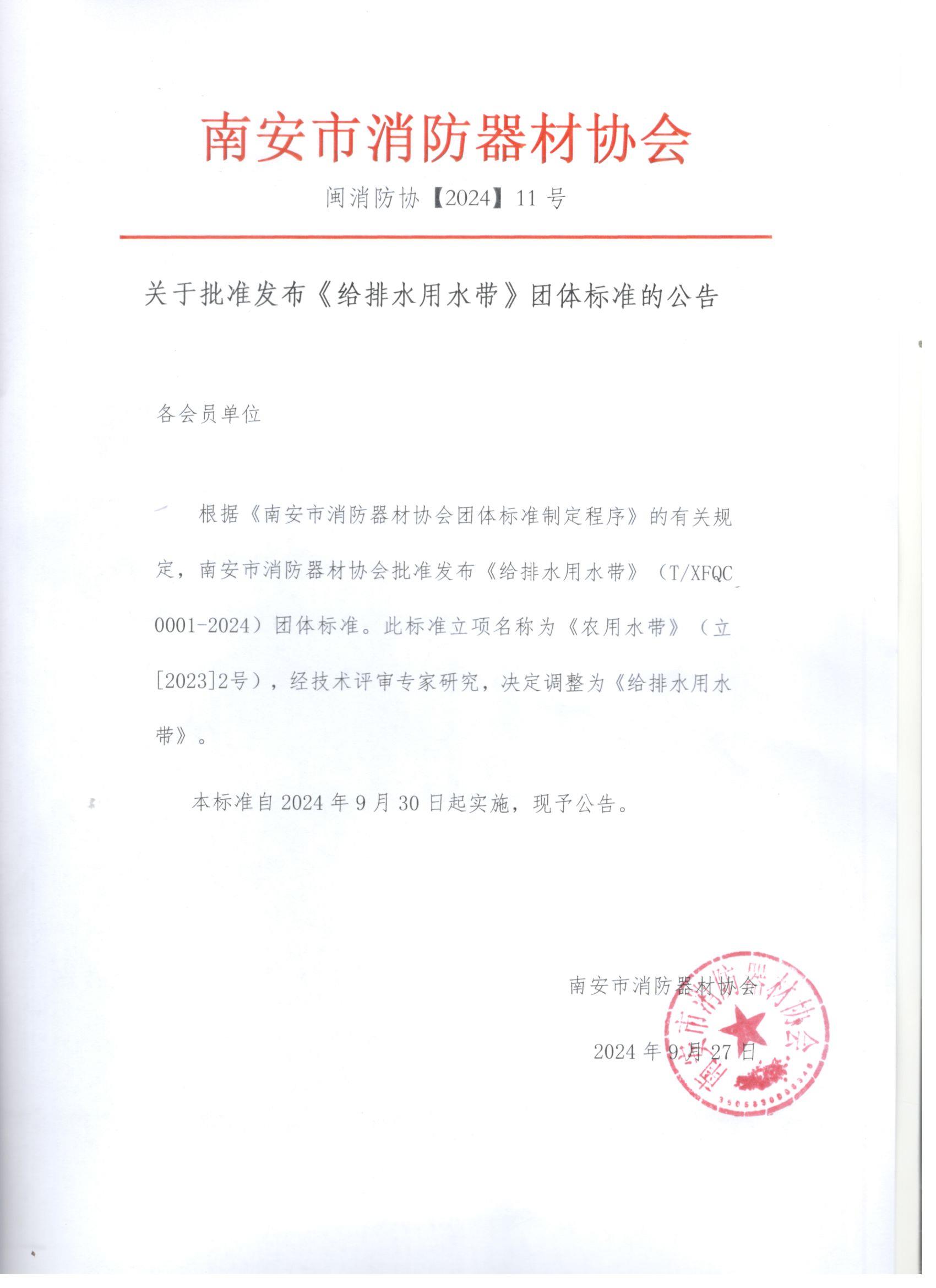 根据《南安市消防器材协会团体标准制定程序》的有关规定,南安市消防器材协会批准发布《给排水用水带》(T/XFQC 0001-2024)团体标准。此标准立项名称为《农用水带》(立[2023]2号),经技术评审专家研究,决定调整为《给排水用水带》。