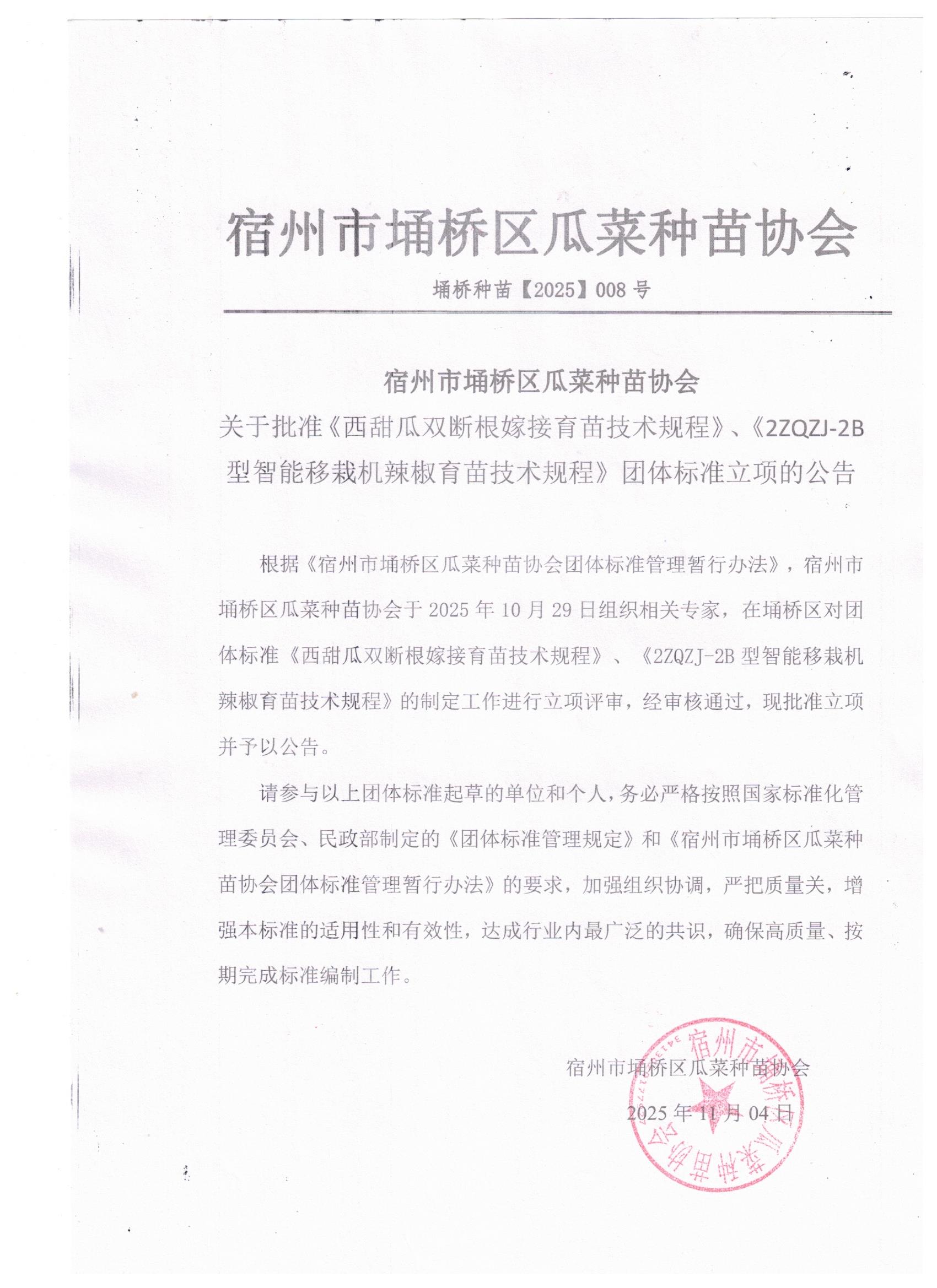 根据《宿州市埇桥区瓜菜种苗协会团体标准管理暂行办法》,宿州市埇桥区瓜菜种苗协会于2025年10月29日组织相关专家,在埇桥区对团体标准《西甜瓜双断根嫁接育苗技术规程》、《2ZQZJ-2B型智能移栽机辣椒育苗技术规程》的制定工作进行立项评审,经审核通过,现批准立项并予以公告。
