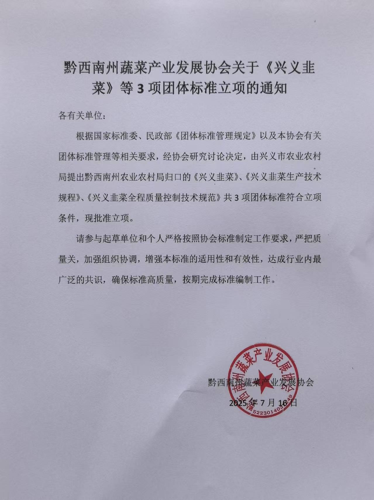 根据国家标准委、民政部《团体标准管理规定》以及本协会有关团体标准管理等相关要求,经协会研究讨论决定,由兴义市农业农村局提出黔西南州农业农村局归口的《兴义韭菜》、《兴义韭菜生产技术规程》、《兴义韭菜全程质量控制技术规范》共3项团体标准符合立项条件,现批准立项。请参与起草单位和个人严格按照协会标准制定工作要求,严把质量关,加强组织协调,增强本标准的适用性和有效性,达成行业内最广泛的共识,确保标准高质量,按期完成标准编制工作。