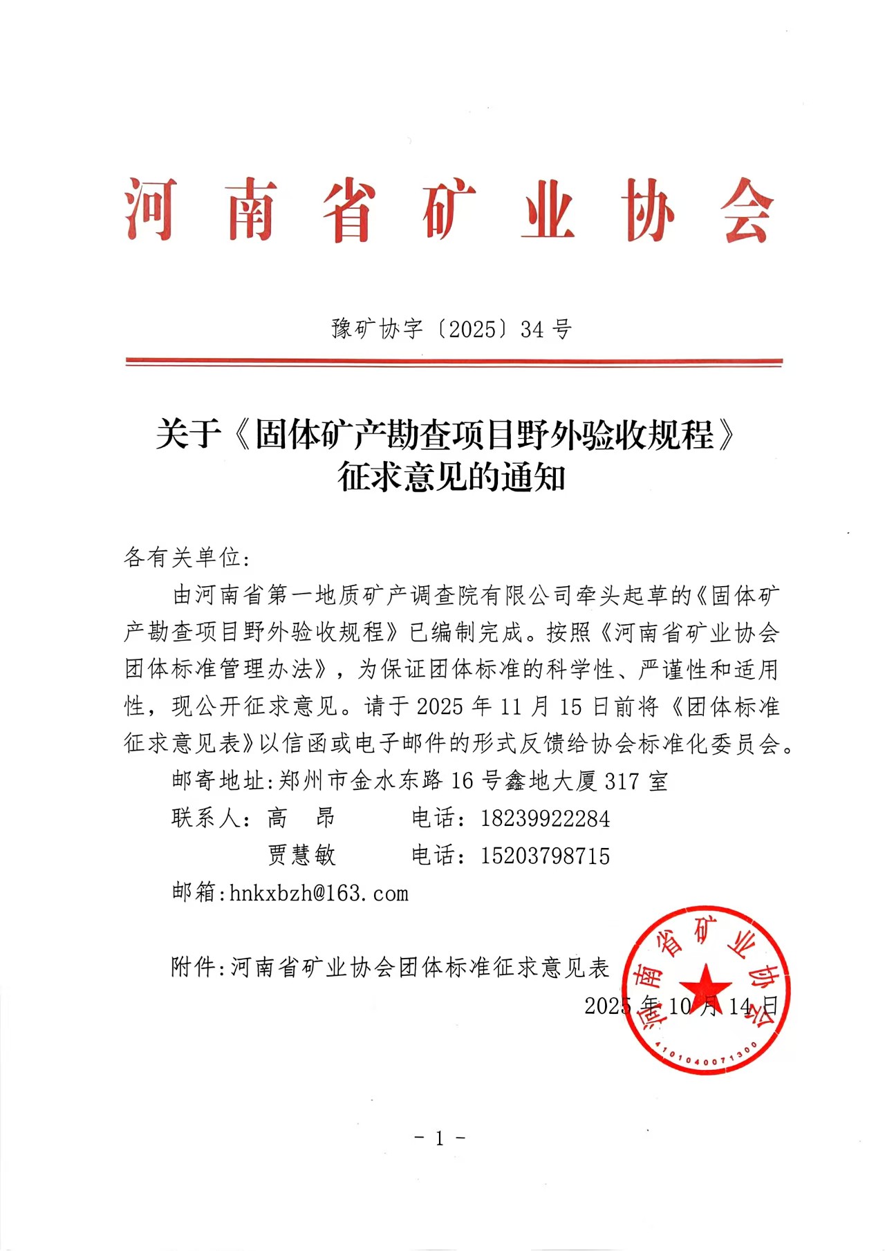 由河南省第一地质矿产调查院有限公司牵头起草的《固体矿产勘查项目野外验收规程》已编制完成。按照《河南省矿业协会团体标准管理法》,为保证团体标准的科学性、严谨性和适用性,现公开征求意见。请于2025年11月15日前将《团体标准征求意见表》以信函或电子邮件的形式反馈给协会标准化委员会。