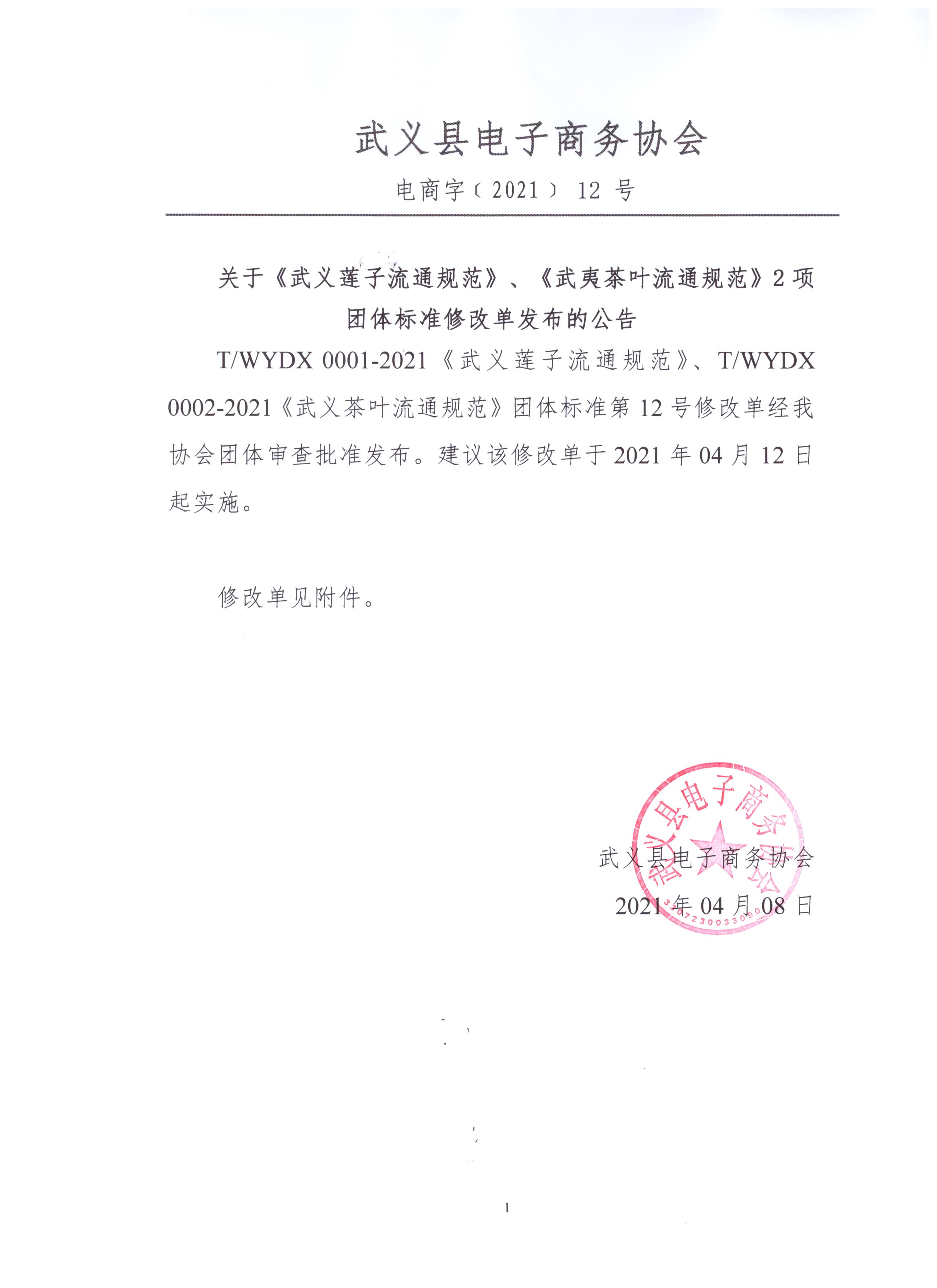 T/WYDX 0001-2021《武义莲子流通规范》、T/WYDX 0002-2021《武义茶叶流通规范》团体标准第12号修改单经我协会团体审查批准发布。建议该修改单于2021年04月12日起实施。