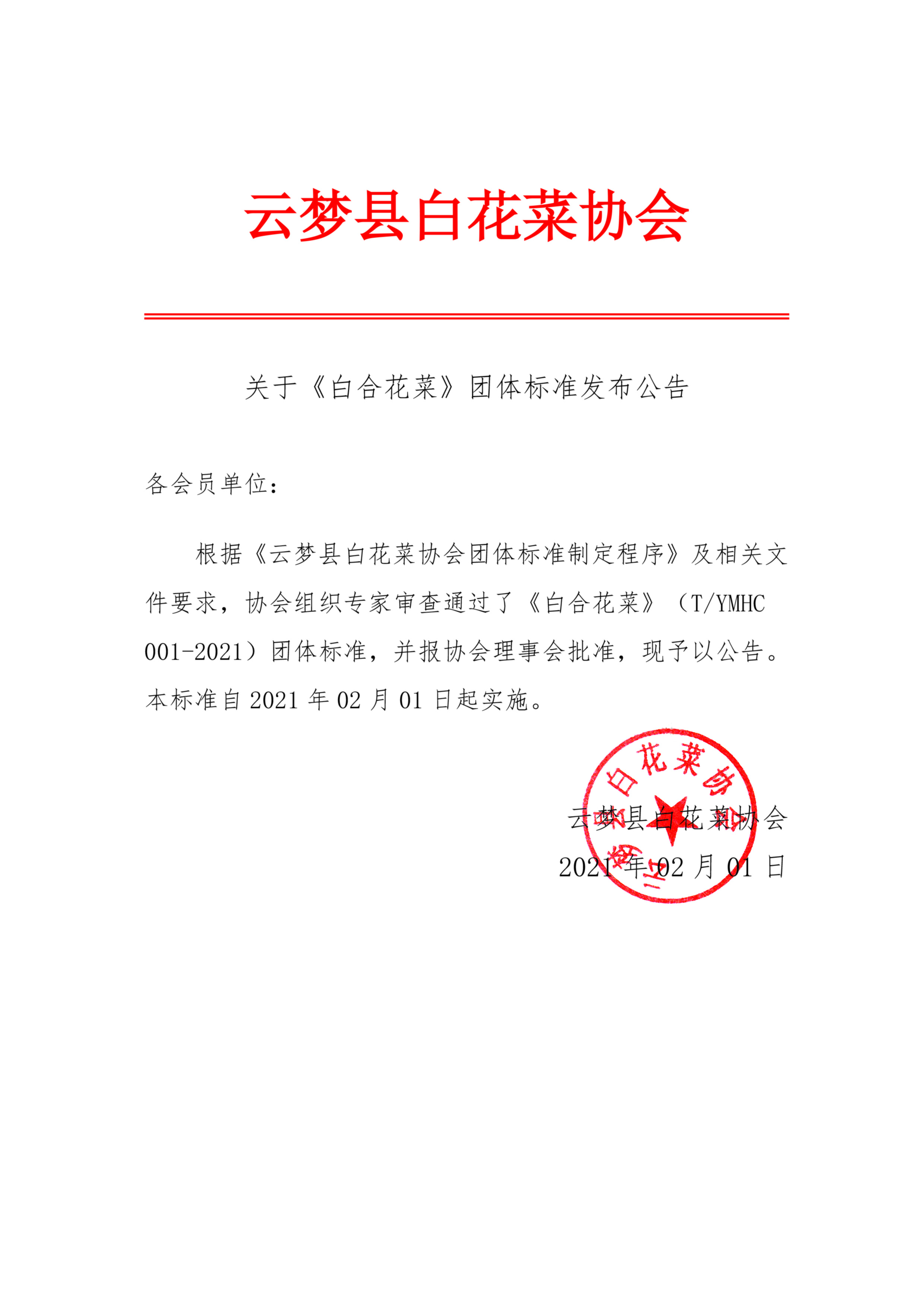 根据《云梦县白花菜协会团体标准制定程序》及相关文件要求,协会组织专家审查通过了《白合花菜》(T/YMHC 001-2021)团体标准,并报协会理事会批准,现予以公告。本标准自2021年02月01日起实施。