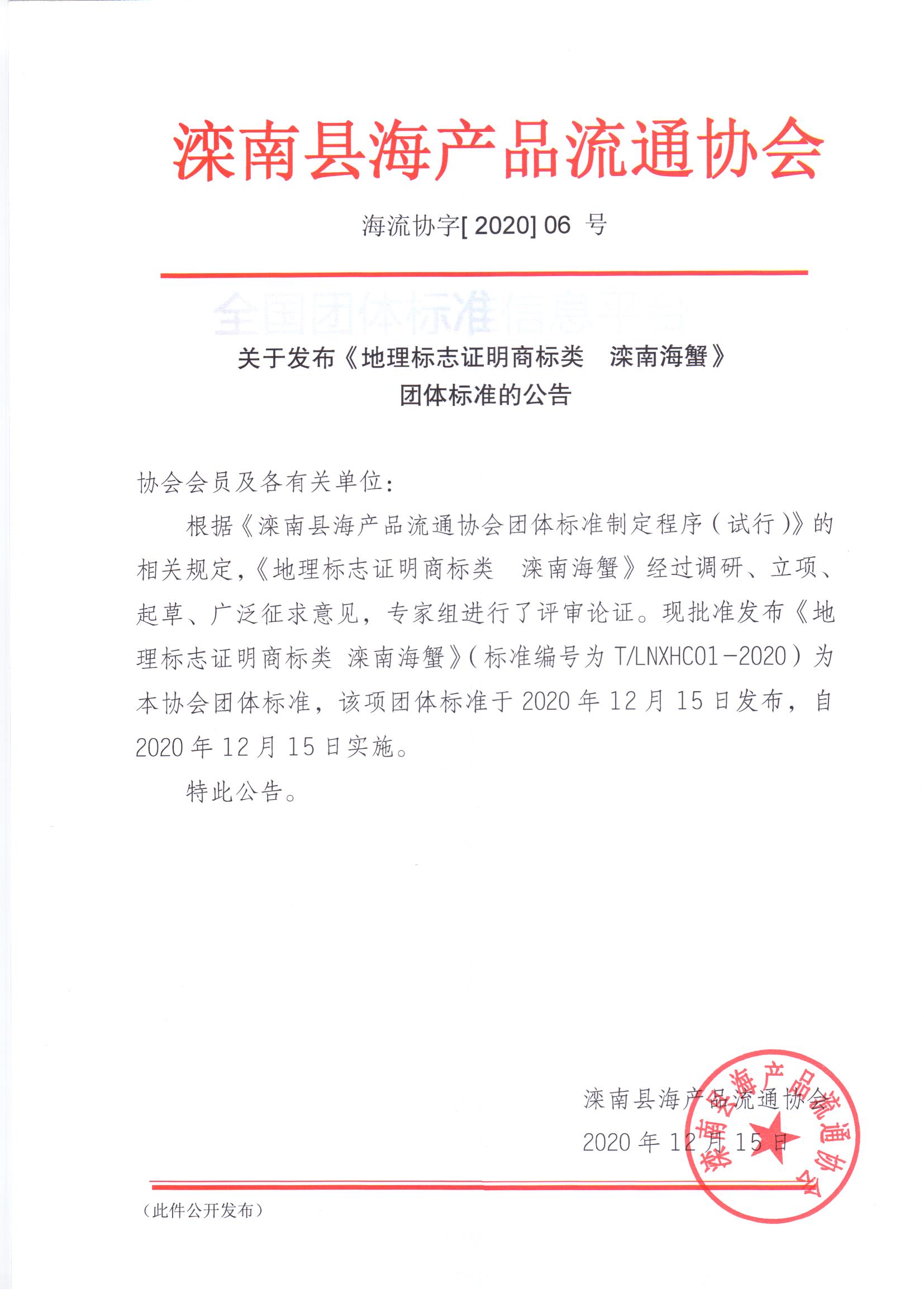 根据《滦南县海产品流通协会团体标准制定程序(试行)》的相关规定,《地理标志证明商标类 滦南海蟹》经过调研、立项、起草、广泛征求意见,专家组进行了评审论证。现批准发布《地理标志证明商标类 滦南海蟹》(标准编号为T/LNXHC01-2020)为本协会团体标准,该项团体标准于2020年12月15日发布,自2020年12月15日实施。