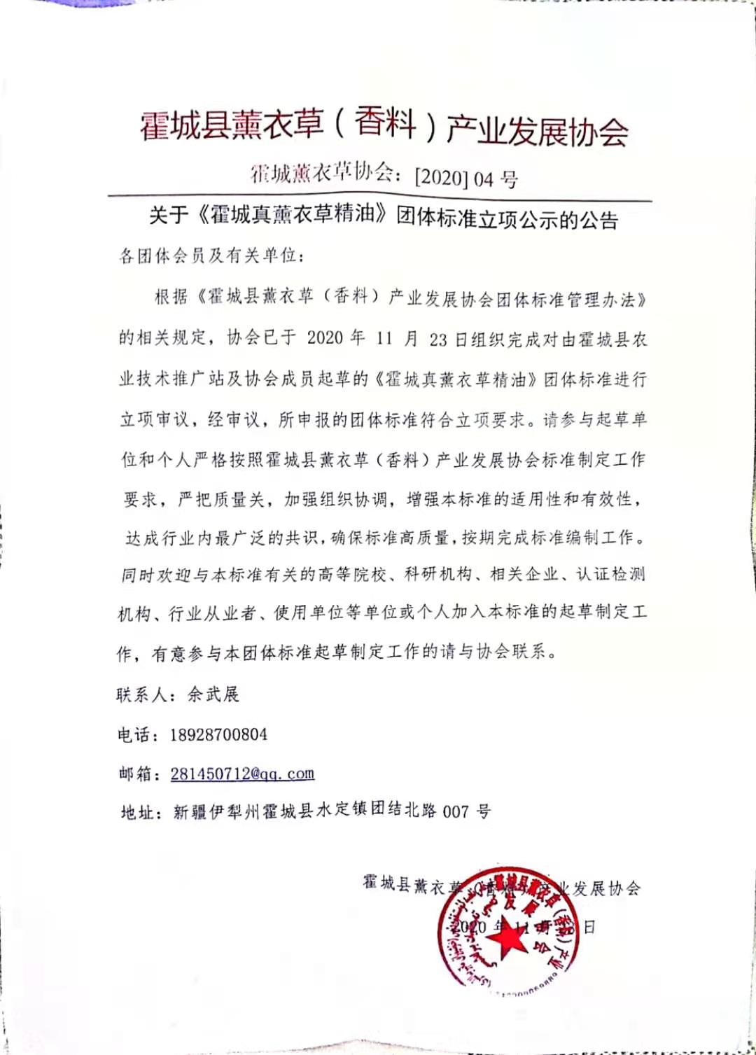根据《霍城县薰衣草(香料)产业发展协会团体标准管理办法》的相关规定,协会已于 2020年 11 月 23日组织完成对由霍城县农业技术推广站及协会成员起草的《霍城真薰衣草精油》团体标准进行立项审议,经审议,所申报的团体标准符合立项要求。请参与起草单位和个人严格按照霍城县薰衣草(香料)产业发展协会标准制定工作要求,严把质量关,加强组织协调,增强本标准的适用性和有效性,达成行业内最广泛的共识,确保标准高质量,按期完成标准编制工作。