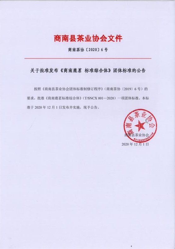 按照《商南县茶业协会团体标准制修订程序》(商南茶协〔2019〕6号)的要求,批准《商南鹿茗标准综合体》(T/SNCX 001—2020)一项团体标准。本标准于2020年12月1日发布并实施,现予公告。