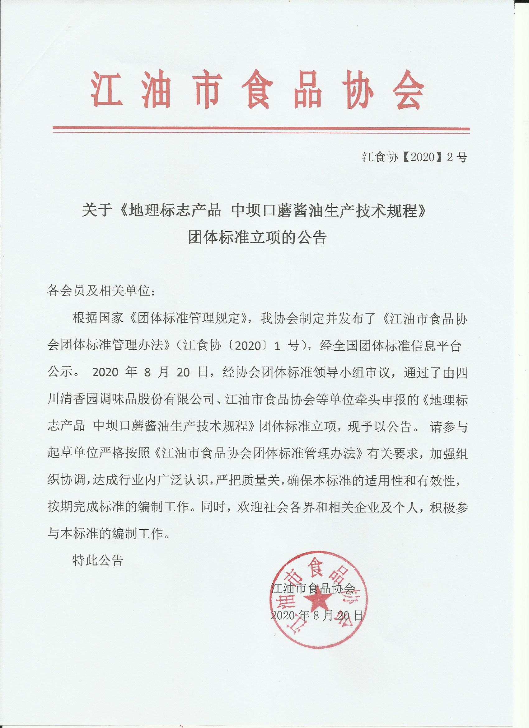 根据国家《团体标准管理规定》,我协会制定并发布了《江油市食品协会团体标准管理办法》(江食协〔2020〕1 号),经全国团体标准信息平台公示。 2020 年 8 月 20 日,经协会团体标准领导小组审议,通过了由四川清香园调味品股份有限公司、江油市食品协会等单位牵头申报的《地理标志产品 中坝口蘑酱油生产技术规程》团体标准立项,现予以公告。 请参与起草单位严格按照《江油市食品协会团体标准管理办法》有关要求,加强组织协调,达成行业内广泛认识,严把质量关,确保本标准的适用性和有效性,按期完成标准的编制工作。同时,欢迎社会各界和相关企业及个人,积极参与本标准的编制工作。