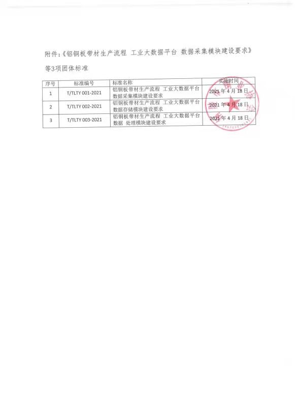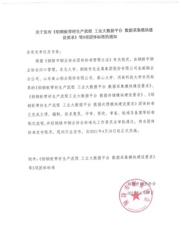 根据《铜陵市铜业协会团体标准管理办法》有关规定,由铜陵市铜业协会归口管理,东北大学、铜陵有色金属集团股份有限公司金威铜业分公司、山东南山铝业股份有限公司、燕山大学、河南科技大学共同起草的《铝铜板带材生产流程 工业大数据平台 数据采集模块建设要求》、《铝铜板带材生产流程工业大数据平台 数据存储模块建设要求》、《铝铜板带材生产流程 工业大数据平台 数据处理模块建设要求》团体标准已完成立項、编制、征求意見、评审、修改、审査、批准及备案等标准制定流程,并经铜陵市铜业协会标准化工作委员会审批通辻,符合团体标准发布程序,现向行业发布,自2021年4月18日起正式实施。