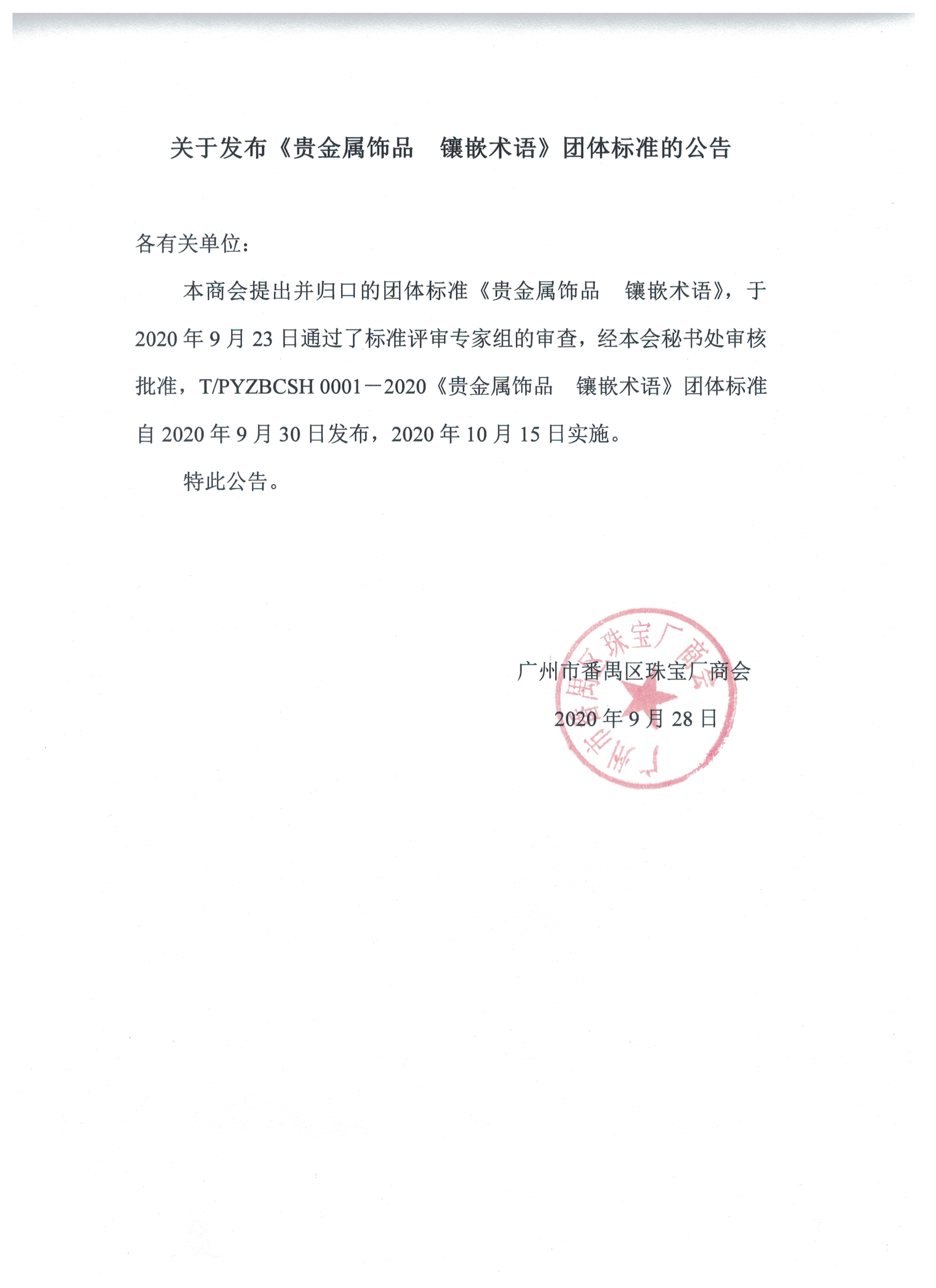 本商会提出并归口的团体标准《贵金属饰品 镶嵌术语》,于2020年9月23日通过了标准评审专家组的审查,经本会秘书处审核批准,T/PYZBCSH 0001-2020《贵金属饰品 镶嵌术语》团体标准自2020年9月30日发布,2020年10月15日实施。
