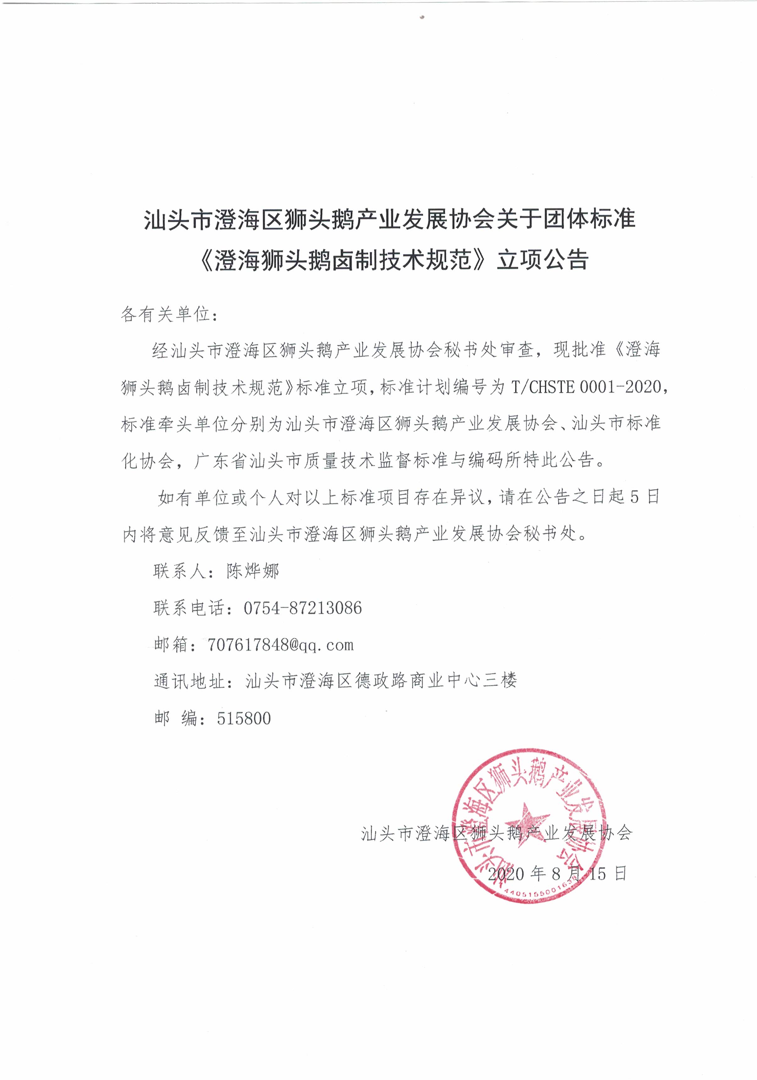 经汕头市澄海区狮头鹅产业发展协会秘书处审查,现批准《澄海狮头鹅卤制技术规范》标准立项,标准计划编号为T/CHSTE 0001-2020,标准牵头单位分别为汕头市澄海区狮头鹅产业发展协会、汕头市标准化协会,广东省汕头市质量技术监督标准与编码所特此公告。