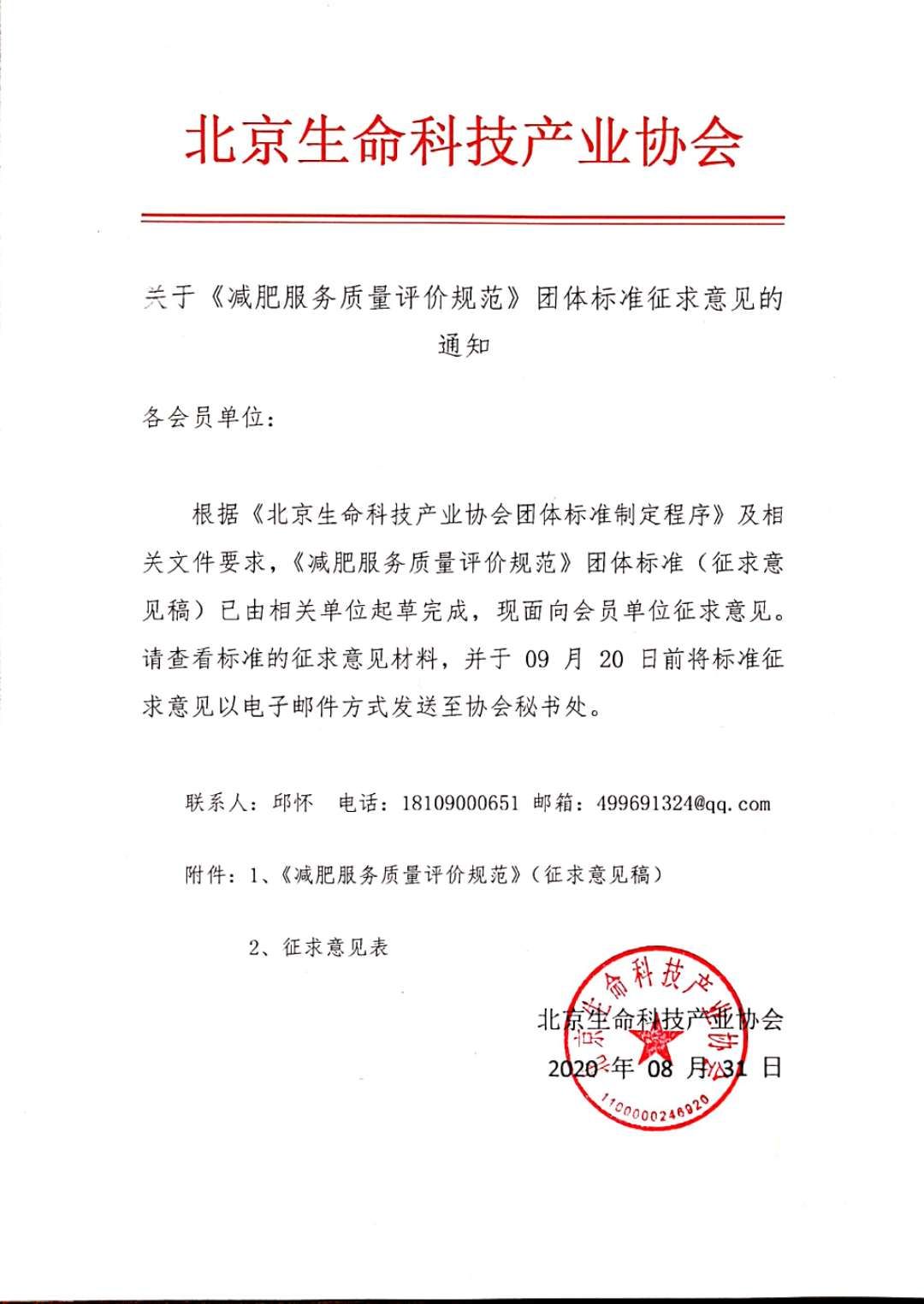根据《北京生命科技产业协会团体标准制定程序》及相关文件要求,《减肥服务质量评价规范》团体标准(征求意见稿)已由相关单位起草完成,现面向全协会会员征求意见。请查看标准的征求意见材料,并于09月20日前将标准征求意见以电子邮件方式发送至北京生命科技产业协会秘书处。