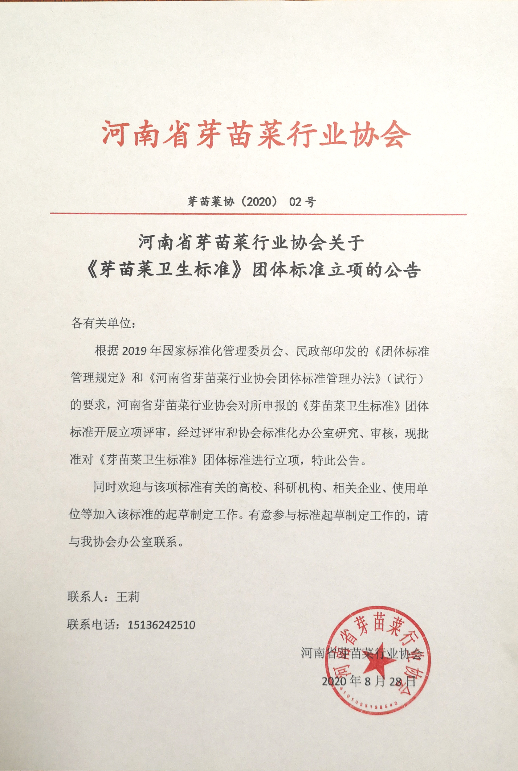 根据2019年国家标准化管理委员会、民政部印发的《团体标准管理规定》和《河南省芽苗菜行业协会团体标准管理办法》(试行)的要求,河南省芽苗菜行业协会对所申报的《芽苗菜卫生标准》团体标准开展立项评审,经过评审和协会标准化办公室研究、审核,现批准对《芽苗菜卫生标准》团体标准进行立项,特此公告。