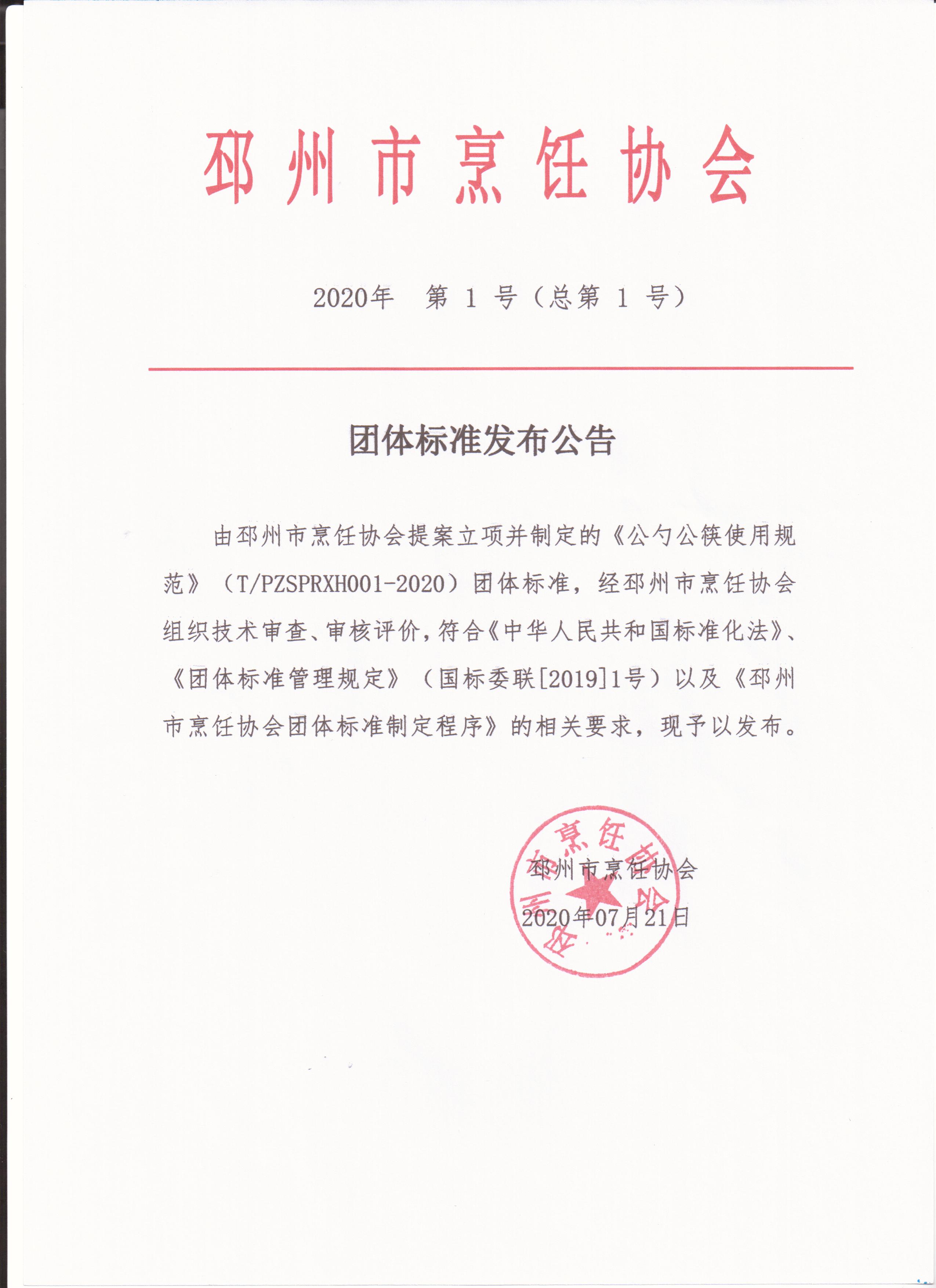 由邳州市烹饪协会提案立项并制定的《公勺公筷使用规范》(T/PZSPRXH001-2020)团体标准,经邳州市烹饪协会组织技术审查、审核评价,符合《中华人民共和国标准化法》、《团体标准管理规定》(国标委联[2019]1号)以及《邳州市烹饪协会团体标准制定程序》的相关要求,现予以公布。