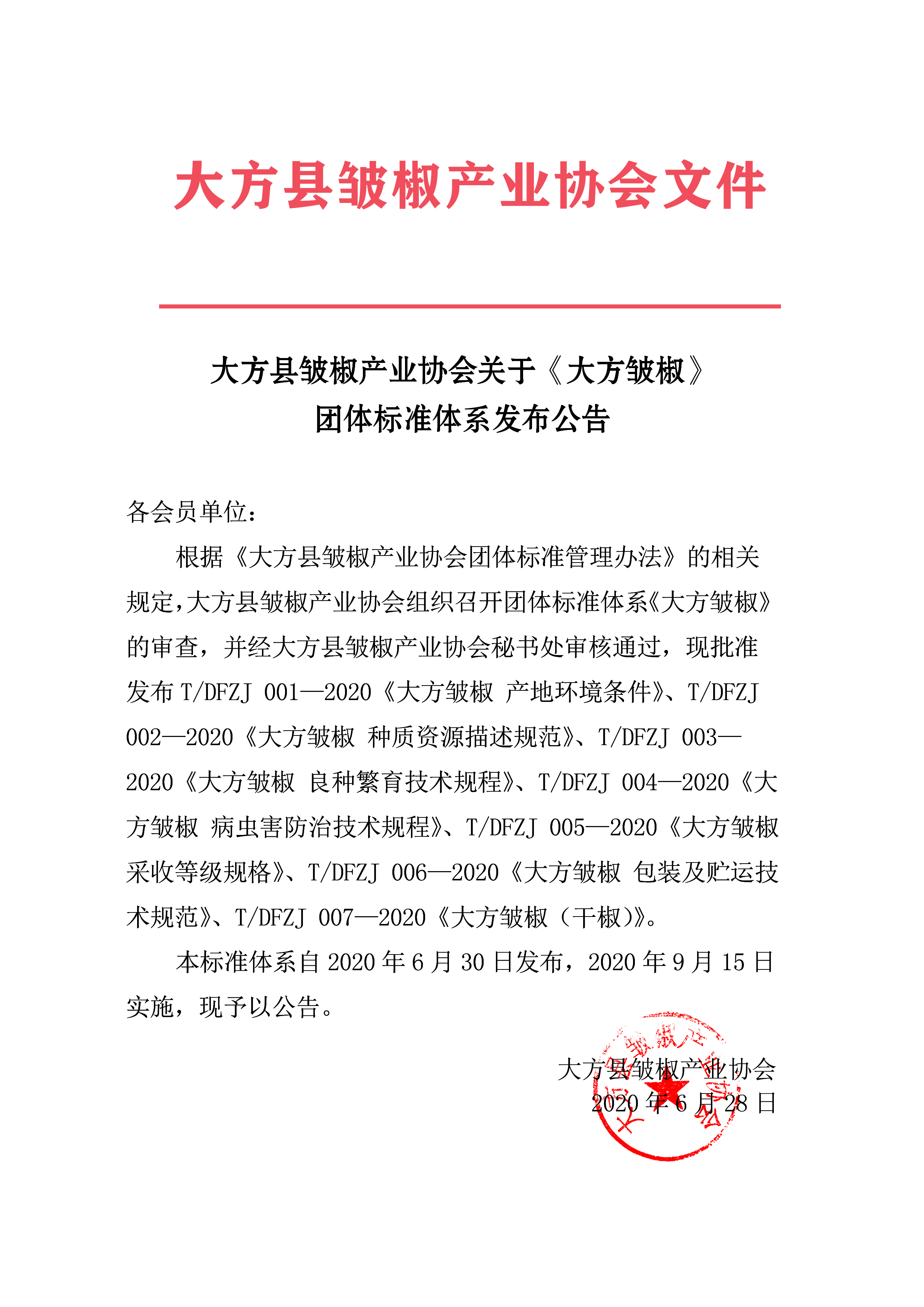 根据《大方县皱椒产业协会团体标准管理办法》的相关规定,大方县皱椒产业协会组织召开团体标准体系《大方皱椒》的审查,并经大方县皱椒产业协会秘书处审核通过,现批准发布T/DFZJ 001—2020《大方皱椒 产地环境条件》、T/DFZJ 002—2020《大方皱椒 种质资源描述规范》、T/DFZJ 003—2020《大方皱椒 良种繁育技术规程》、T/DFZJ 004—2020《大方皱椒 病虫害防治技术规程》、T/DFZJ 005—2020《大方皱椒 采收等级规格》、T/DFZJ 006—2020《大方皱椒 包装及贮运技术规范》、T/DFZJ 007—2020《大方皱椒(干椒)》。