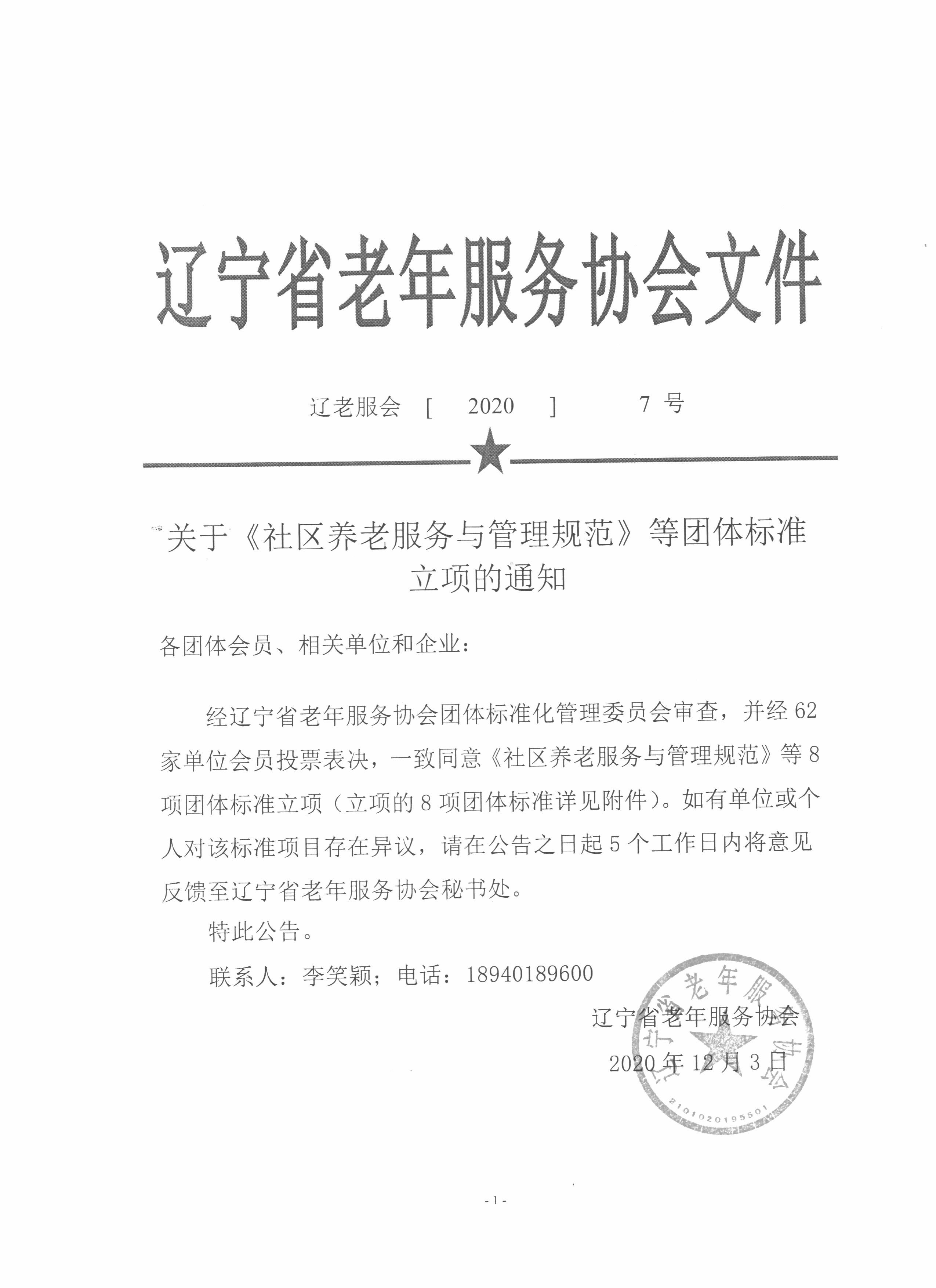 经辽宁省老年服务协会团体标准化管理委员会审查,并经62家单位会员投票表决,一致同意《社区养老服务与管理规范》等8项团体标准立项(立项的8项团体标准详见附件)。如有单位或个人对该标准项目存在异议,请在公告之日起5个工作日内将意见反馈至辽宁省老年服务协会秘书处。特此公告。
