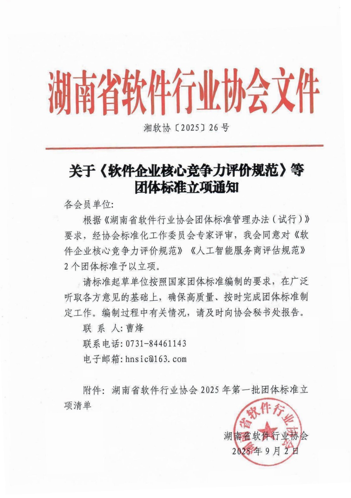 湖南省软件行业协会关于《软件企业核心竞争力评价规范》等2项团体标准立项通知